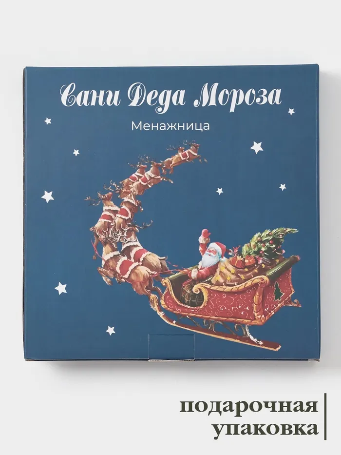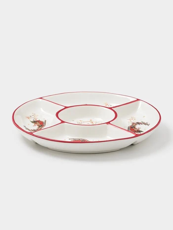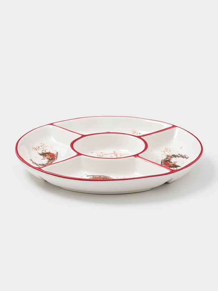 Новогодняя менажница с рисунком саней — не просто ёмкость для закусок, а умный организатор праздничного стола. Пять ячеек в круглой композиции позволяют разделить оливье, винегрет, селёдку под шубой, маринованные огурцы и маслины — без смешивания, без суеты. Белая керамика и деликатный рисунок добавляют лёгкую праздничную ноту, не перегружая сервировку.