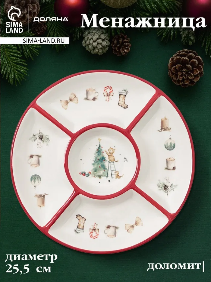 Менажница новогодняя Доляна «Волшебный праздник», 5 секций, 25.5×3.1 см, доломит, белая — Характеристики