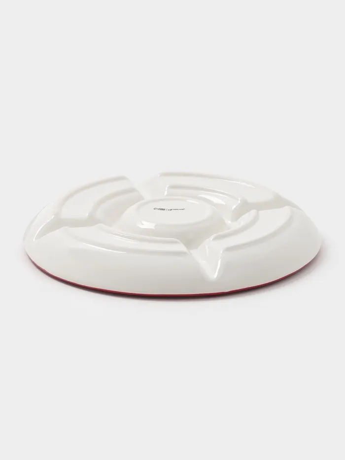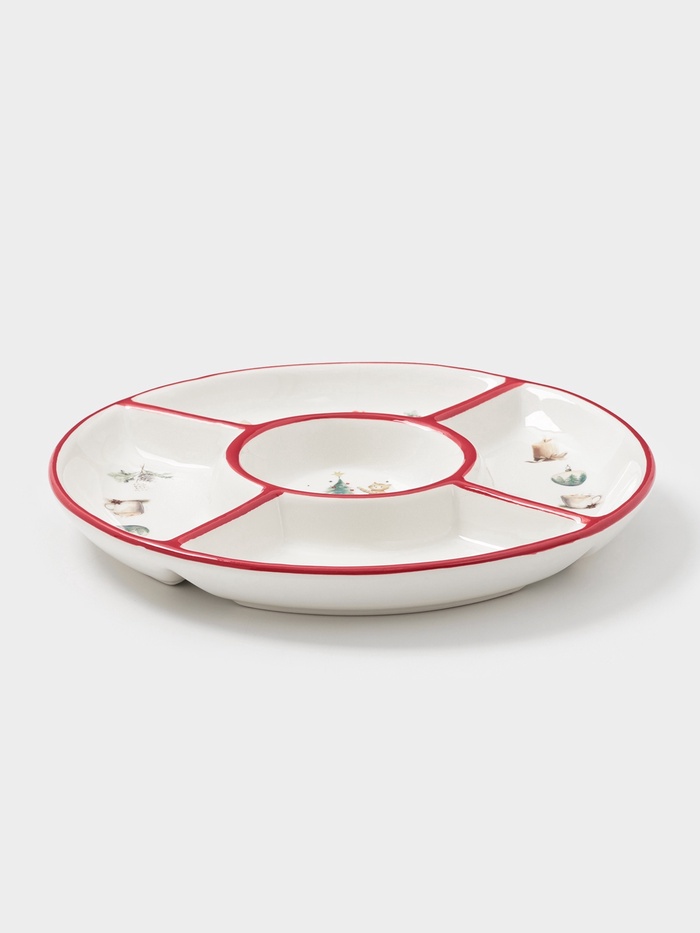 Погрузитесь в атмосферу волшебства с элегантной «Новогодней Менажницей» – идеальным выбором для праздничного стола. Изготовленная из доломита, эта керамическая круглая тарелка белого цвета собирает в себе изящество и утонченность, предлагая пять секций для сервировки вашей любимой новогодней закуски.