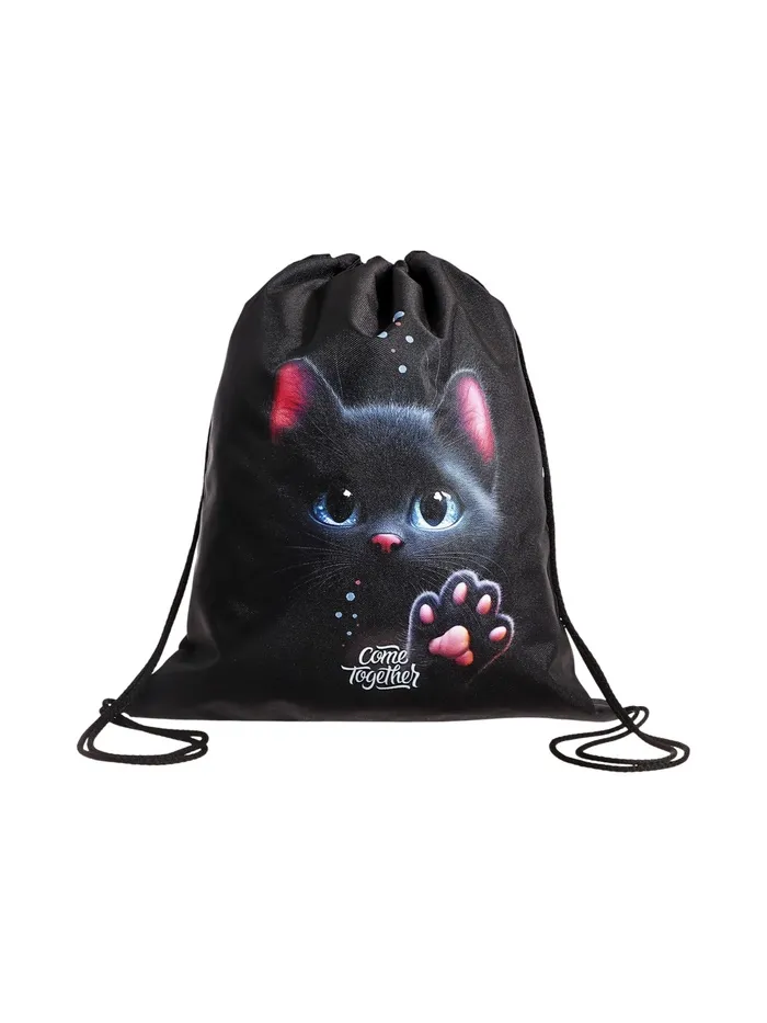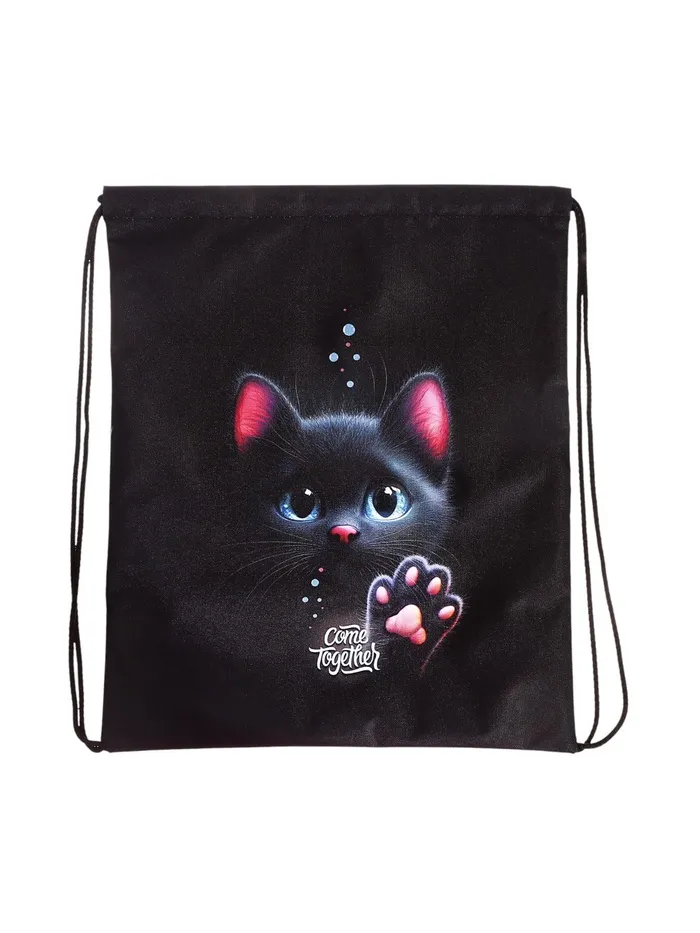 Мешок для обуви с милым котёнком — практичное решение для школы и спортивных занятий. Чёрный фон с контрастным рисунком скрывает загрязнения, сохраняя аккуратный вид.