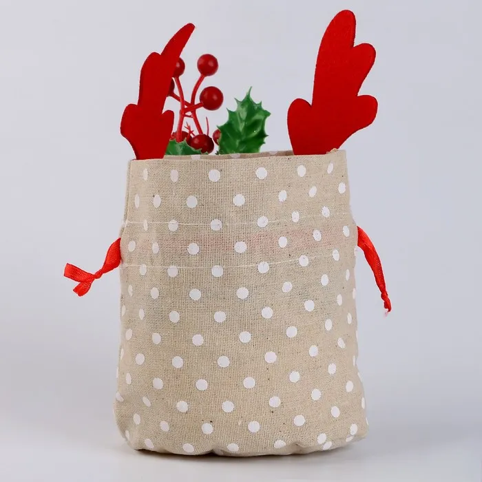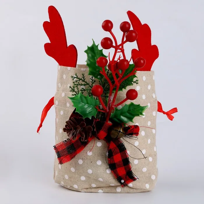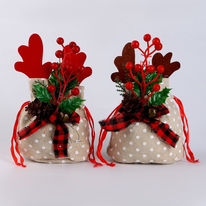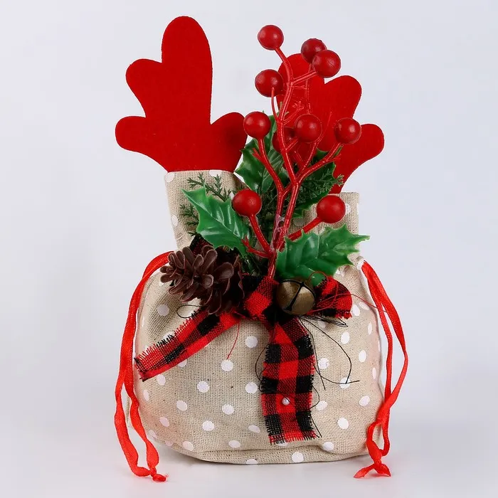 Текстильный мешочек с рожками как у оленя и декором ягодок, поможет красиво упаковать подарок к Новому году.
