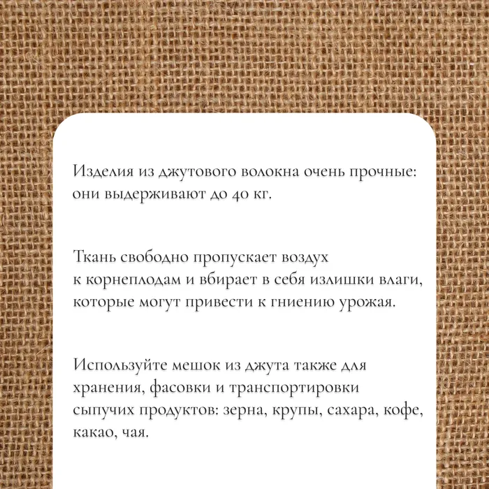 Лёгкий и вместительный мешок из джута пригодится для хранения урожая. Материал производится из кустарников семейства липовых. Он полностью натуральный и экологичный.