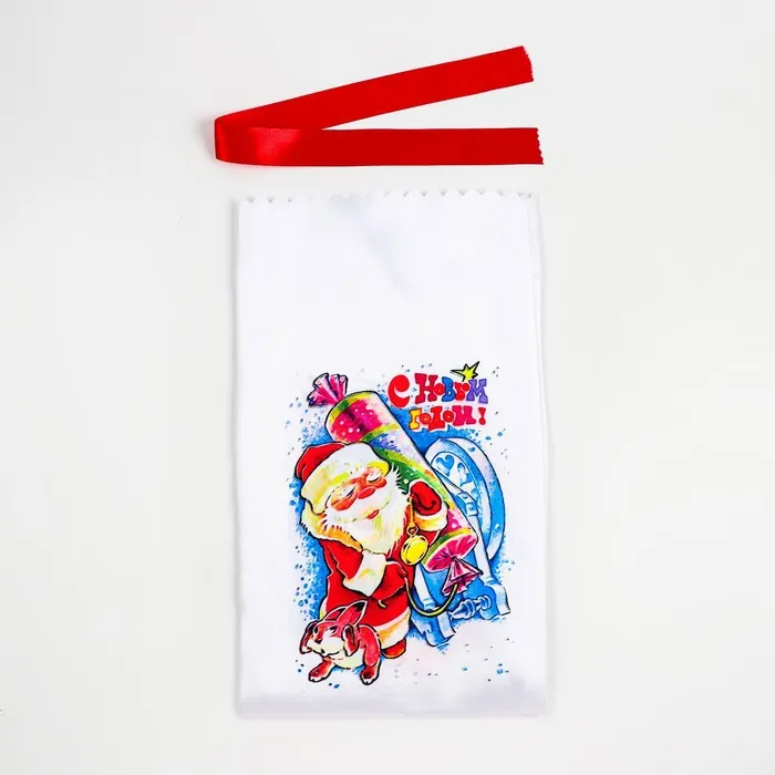 - Изготовленный из атласа, он обладает гладкой и блестящей поверхностью, что придаёт ему нарядный и праздничный вид. Полноцветная печать с изображением Деда Мороза и хлопушки создаёт атмосферу веселья и радости, характерную для зимних праздников.
