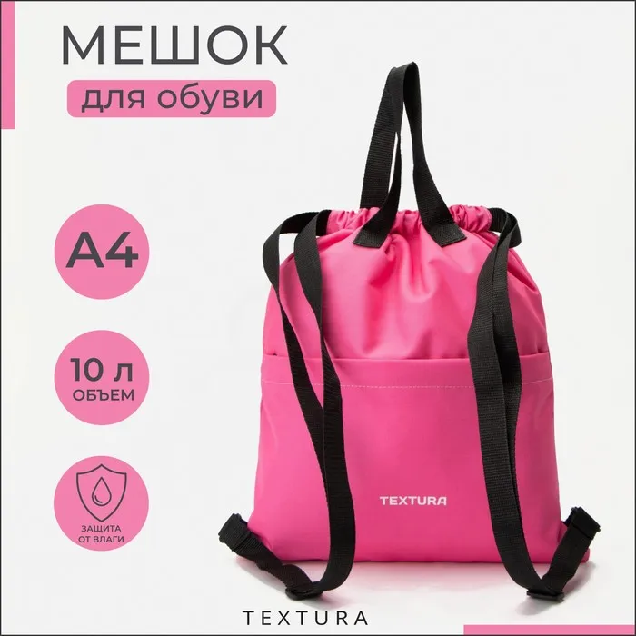 Мешок-сумка для обуви на стяжке TEXTURA, наружный карман, цвет розовый — Характеристики