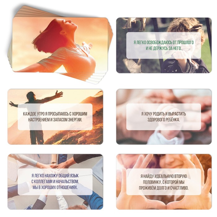 Метафорические ассоциативные карты (МАК) — это набор картинок, которые используют для диагностики и проработки психологических проблем, а также для обучения, самопознания, игр и творчества. К аффирмации можно отнести короткие и чётко сформулированные фразы, которые необходимо многократно повторять для действенности. Только так позитивная установка, заложенная в эту фразу, фиксируется в подсознании человека. Частое повторение коротких фраз называют аутотренингом, который положительно воздействует на психоэмоциональное состояние и способствует позитивным изменениям в жизни.
