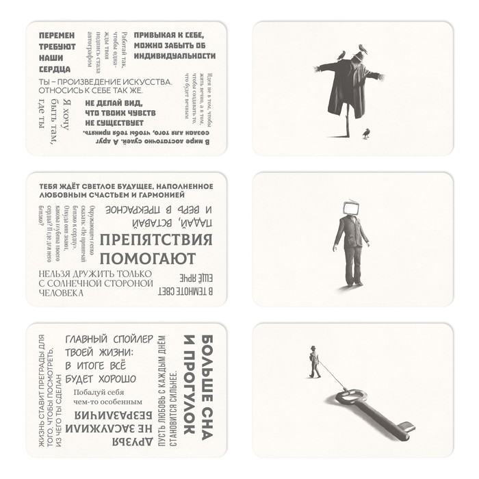 Текстовые карты в колоде помогут в определении текущего эмоционального состояния, настроя и готовности преодолевать трудности. Каждые слова, фразы и подсказки – знаки и сигналы, которые помогут распутать клубок запутанных препятствий и подарить разуму свободу и гармонию.