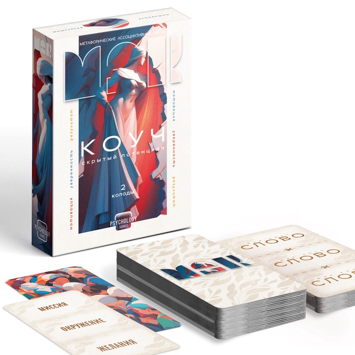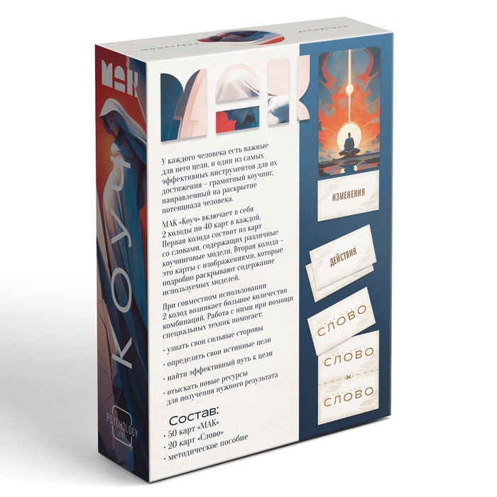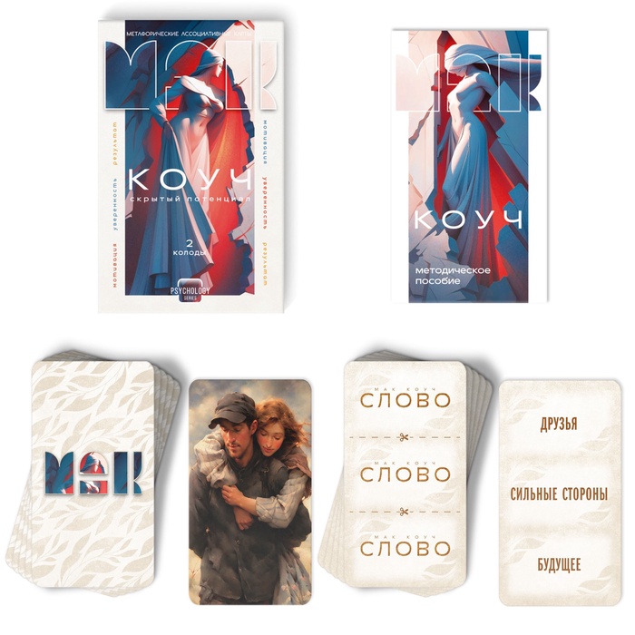 Набор коучинговых МАК включает в себя 2 колоды по 40 карт в каждой. Первая колода состоит из карт со словами, содержащих различные коучинговые модели. Вторая колода – это карты с изображениями, которые подробно раскрывают содержание используемых моделей.