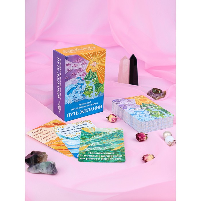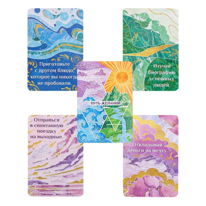 Метафорические ассоциативные карты МАК "Путь желаний" Колода карт «Путь желаний» — это ваш проводник к своему внутреннему миру, к исполнению желаний и чудесам в жизни. Карты активизируют подсознание и помогают наполнить «колесо баланса»! Когда начинается работа над собой, когда царит гармония во всех сферах жизни, мечты начинают сбываться. Карты разделены на четыре сферы жизни, символизирующие основные природные стихии. Колода состоит из 68 карт с заданиями, которые необходимо выполнять каждый день. Эти карты универсальные и могут использоваться как гадальные карты либо как терапевтические карты для мужчин и для женщин. Это простой и понятный инструмент психотерапии и самопознания. Магические карты можно приобрести в подарок, ведь данные подарочные карты подойдут всем, кто интересуется психологией и саморазвитием. Психологические метафорические карты станут хорошим подарком всем кто увлекается оккультизмом, нумерологией, язычеством, астрологией и психологией.