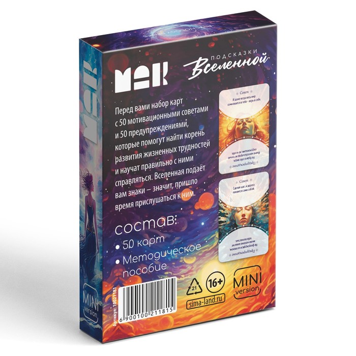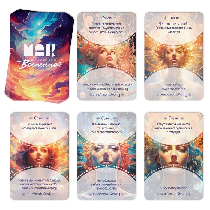 Внутри собрано 50 карт с мотивационными фразами, советами и предупреждениями, которые помогут справиться с разными ситуациями из жизни. Важно быть внимательными к знакам судьбы и прислушиваться к ним, ведь только так можно предостеречь себя от ошибок и непреодолимых действий.
