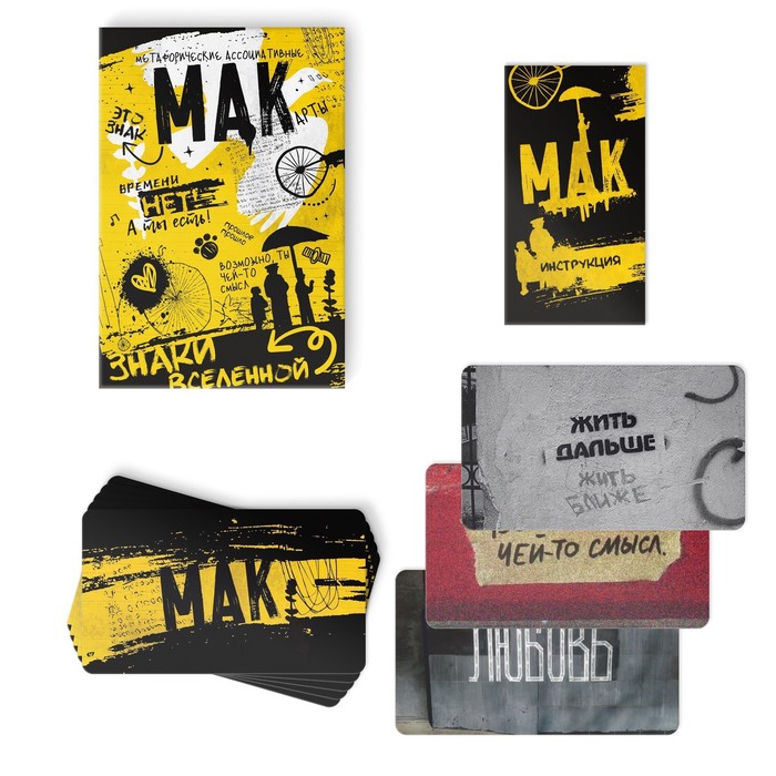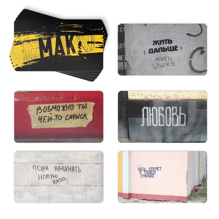 Метафорические ассоциативные карты (МАК) – это набор картинок, которые помогут заглянуть вглубь подсознания и получить ответы на интересующие вопросы. В колоде «Подсказки судьбы» вас ждут надписи и граффити на стенах. Благодаря этой колоде вам не придётся всюду искать знаки. Карты здесь – это не просто картинки, это знаки, послания, мечты и конкретные шаги, способные изменить жизнь к лучшему.