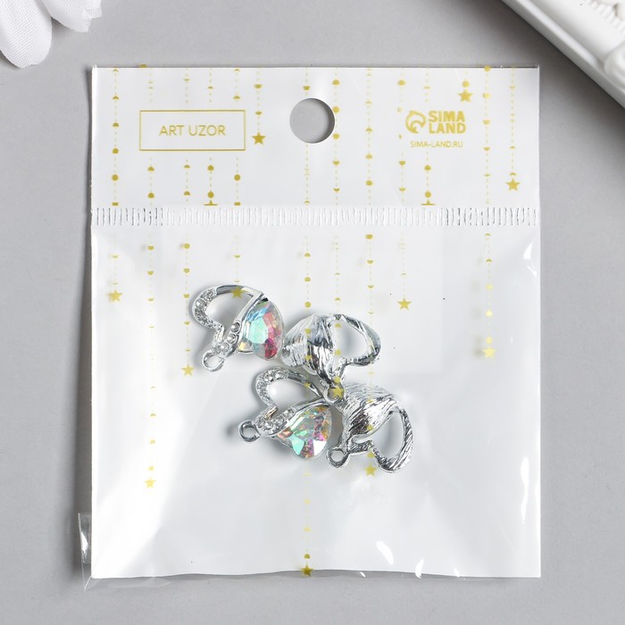 Металлический элемент, декоративная подвеска «Арт Узор. Двойное сердце», стразы, серебро, 1.7×1.8 см