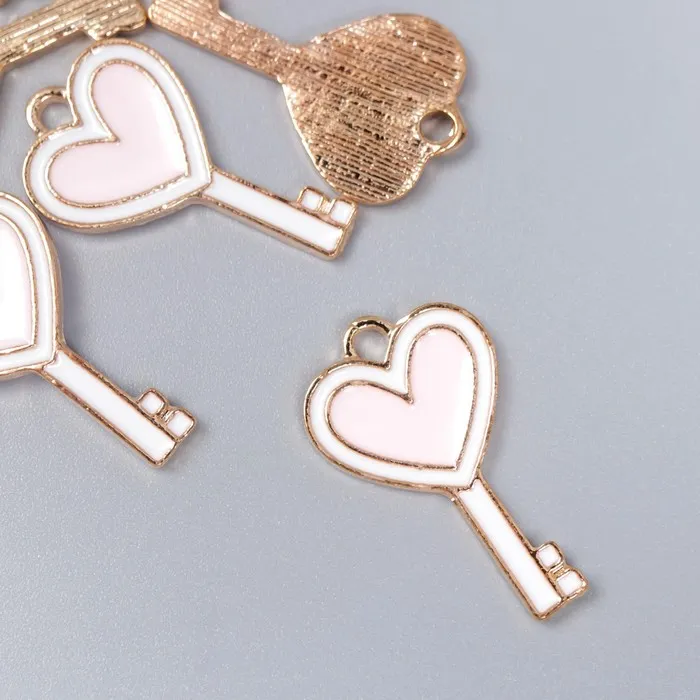 Металлический элемент, декоративная подвеска «Арт Узор. Ключик с сердцем», эмаль, бело-розовый, 1.3×2.3 см