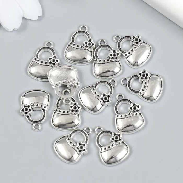 Металлический элемент, декоративная подвеска «Арт Узор. Сумочка с цветком», набор 12 шт., серебро, 1.3×1.9 см
