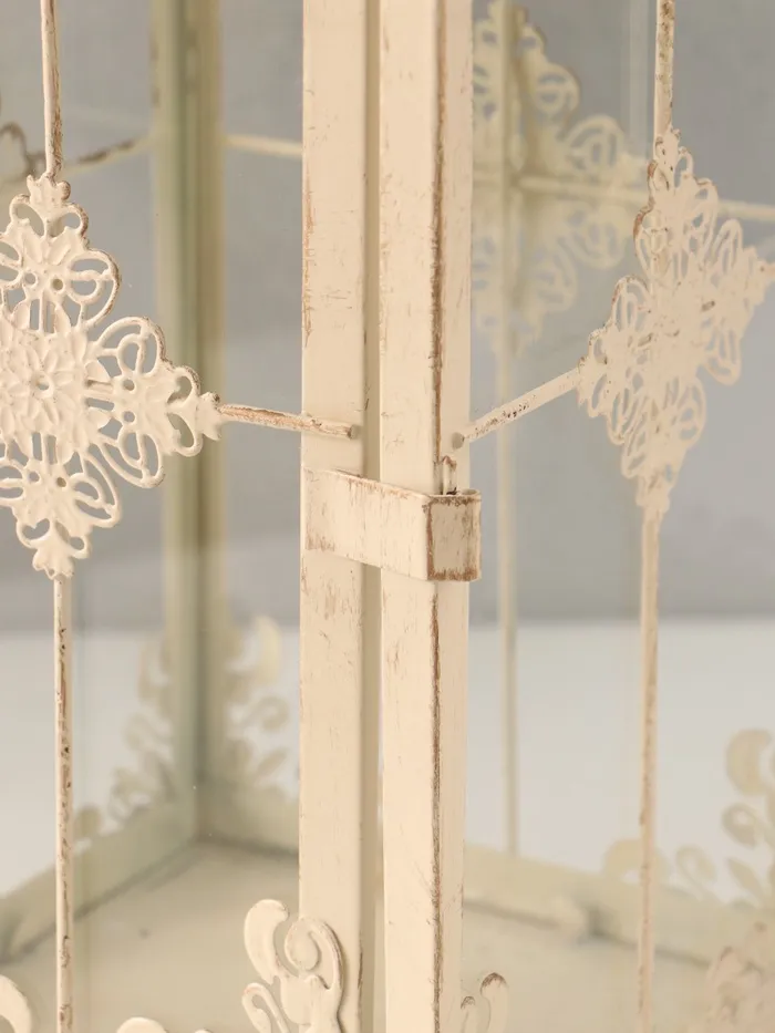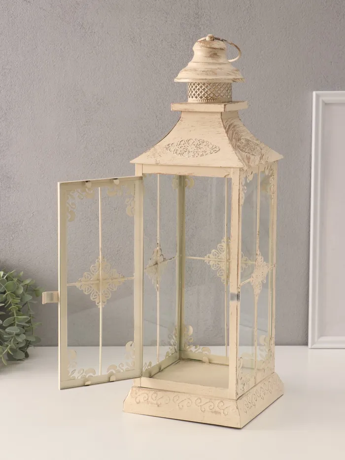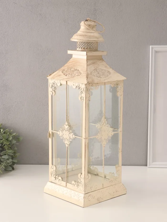 Металлический подсвечник-фонарь на 1 свечу «Ажурный ромб», металл, стекло, белый с патиной, 52.5×17.5×17.5 см — Характеристики