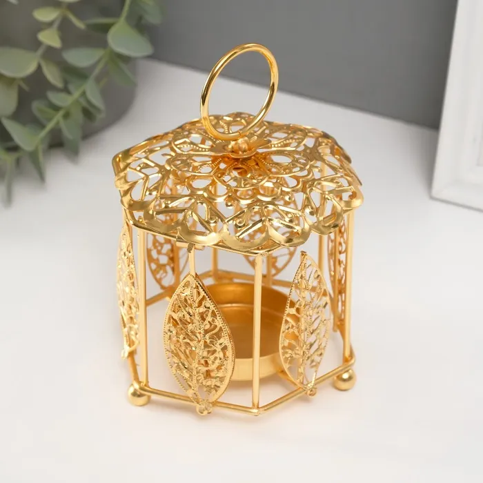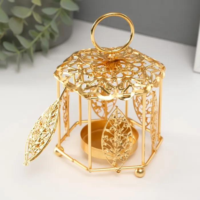 Металлический подсвечник-фонарь на 1 свечу «Цветок и листья», золото, d=5.5 см, 9.8×10.5×14 см — Характеристики