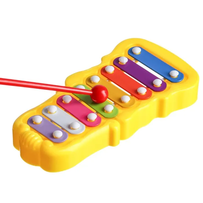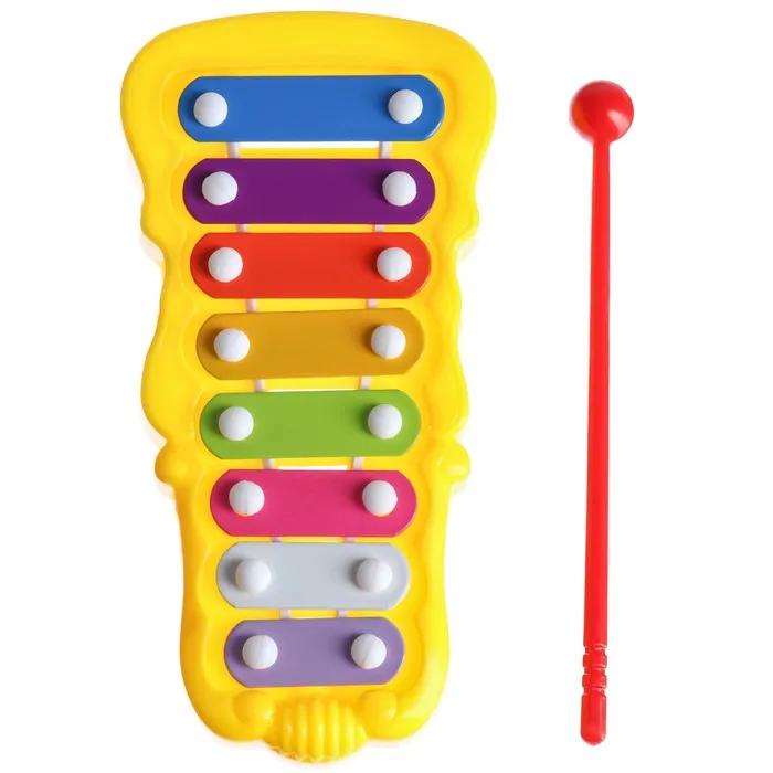 - Скруглённые пластины из качественного металла и насыщенное звучание. Малыш услышит разницу между нотами и научится сочетать их.