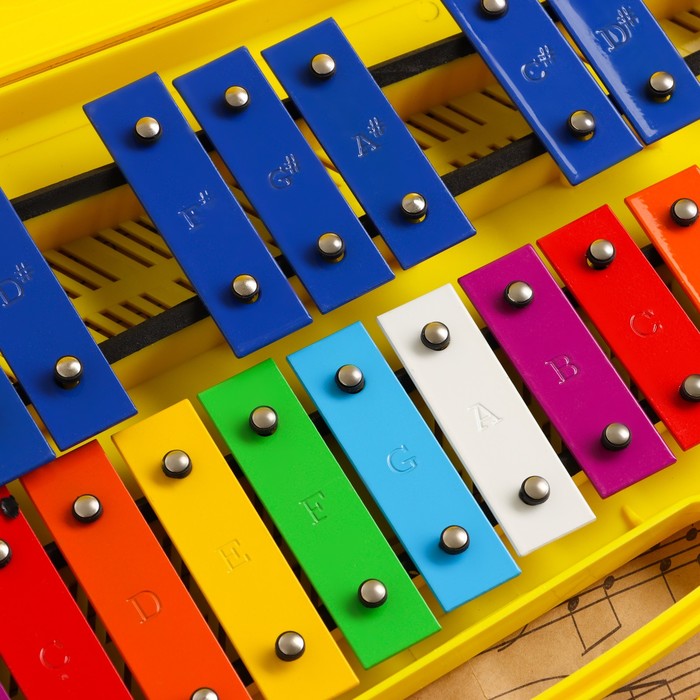 Металлофон музыкальный инструмент Music Life, 25 тонов, футляр, 2 палочки, желтый — Характеристики
