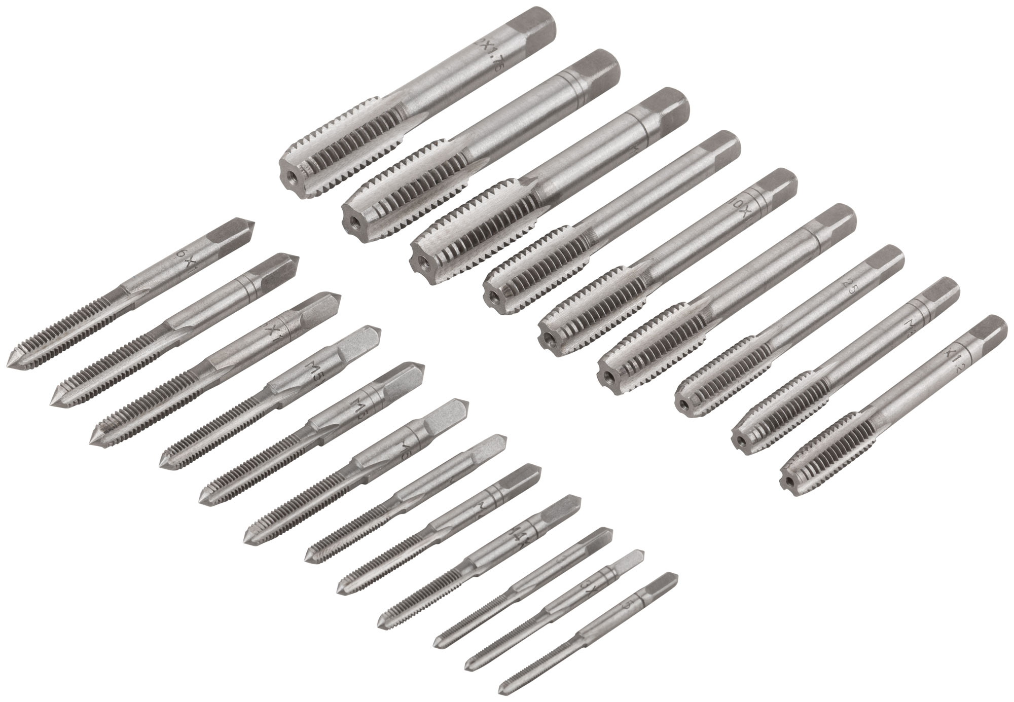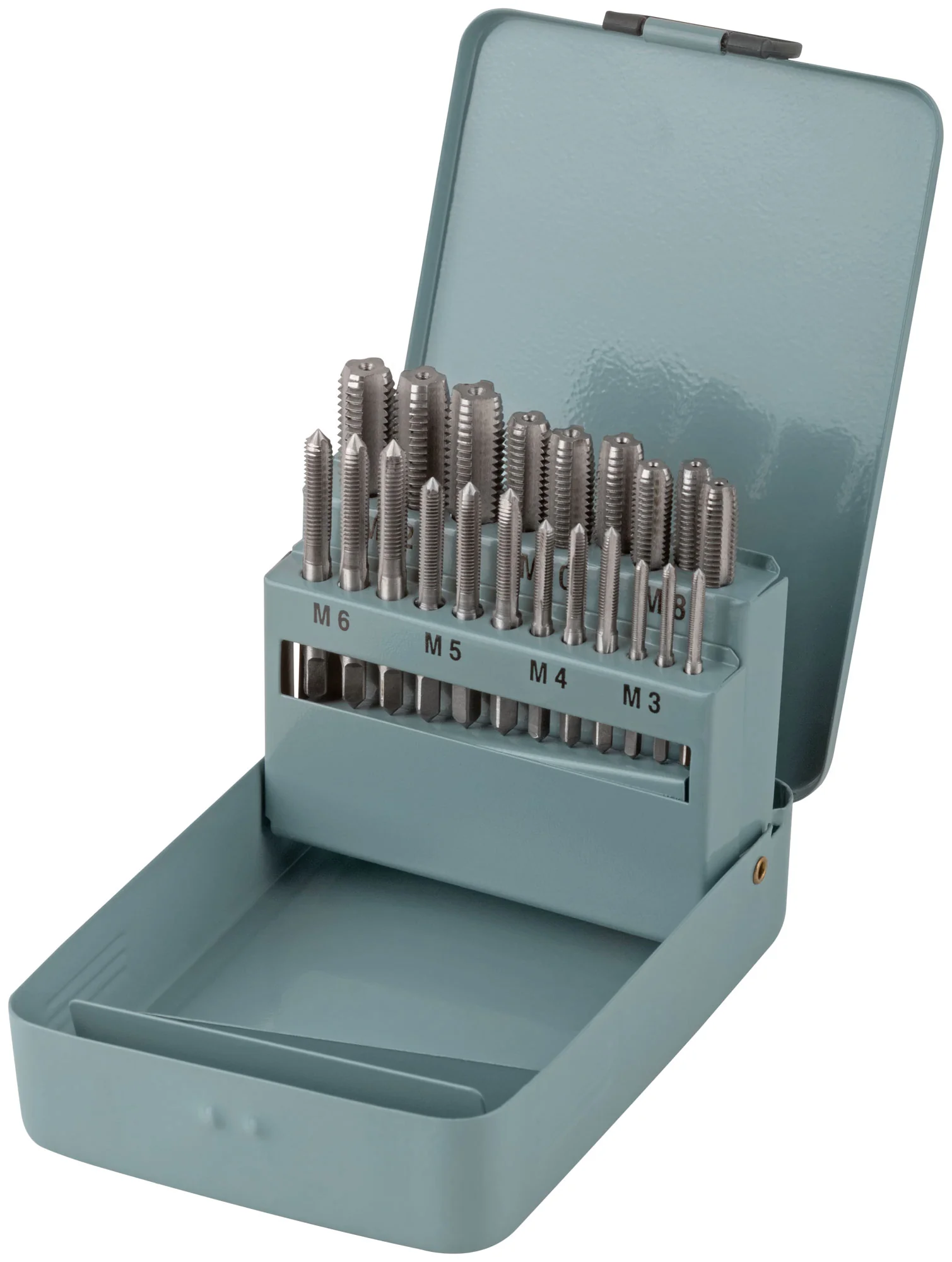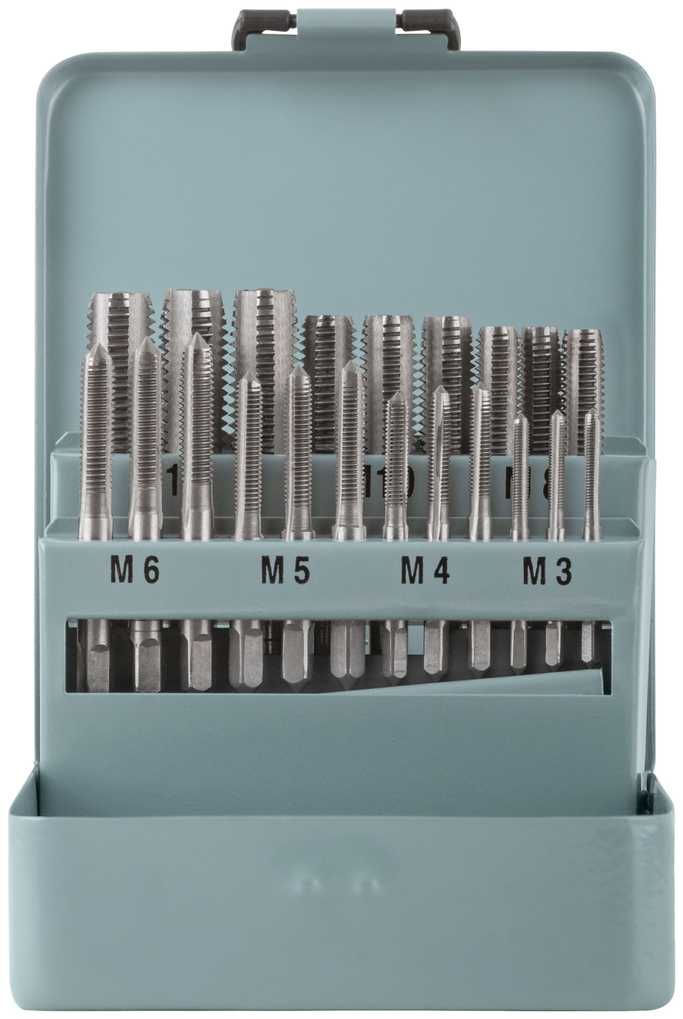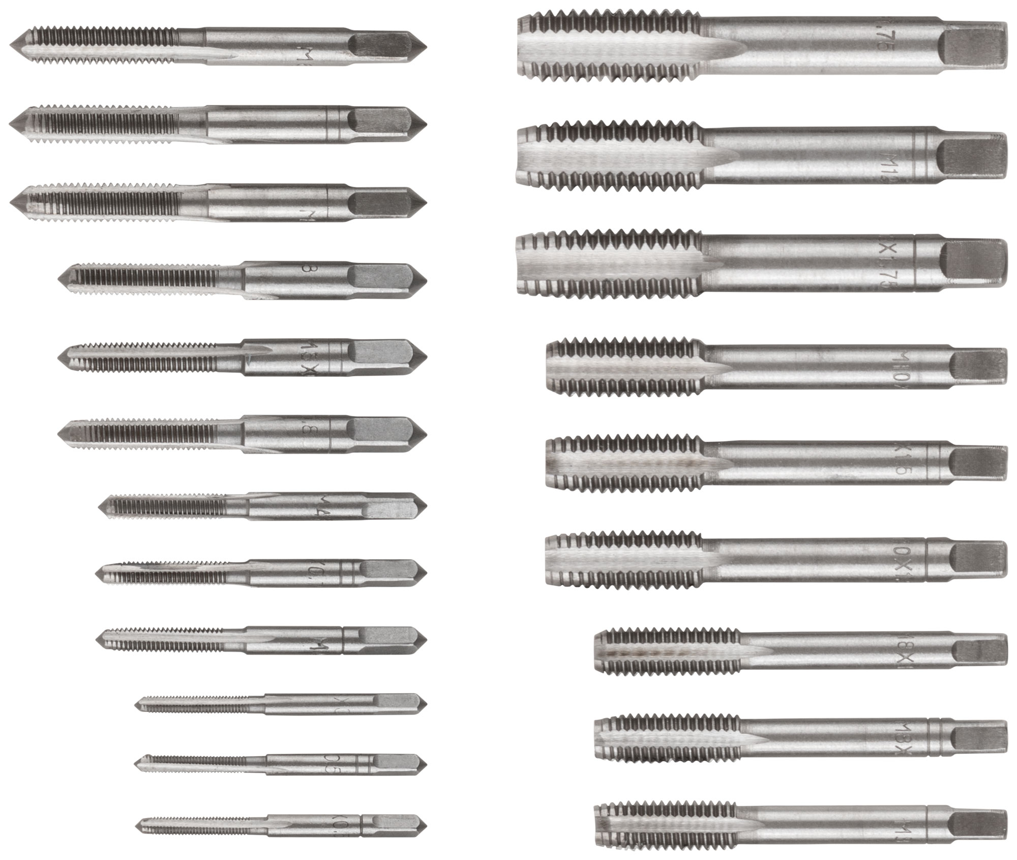 Метчики изготовлены из легированной инструментальной стали, что обеспечивает долговечность и износостойкость. В комплект входят 21 метчик, распределенные по размерам: М3 x 0,5, М4 x 0,7, М5 x 0,8, М6 x 1,0, М8 x 1,25, М10 x 1,5, М12 x 1,75. Каждый размер представлен тремя видами метчиков для различных этапов нарезания резьбы.