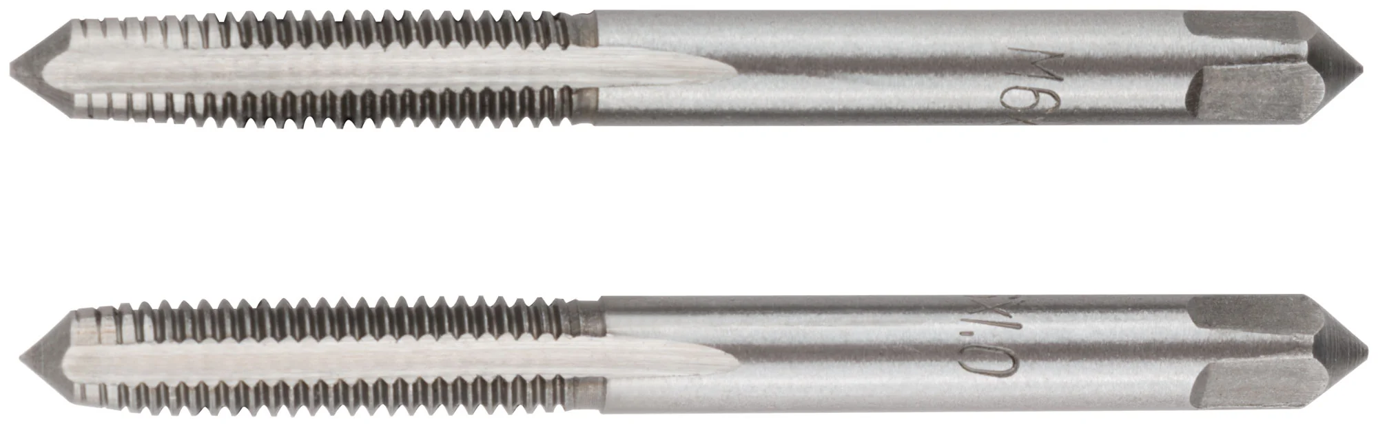 Метчики изготовлены из легированной стали и закалены до твердости HRC 58-60, что обеспечивает долгий срок службы и устойчивость к износу. Набор включает метчики для грубой и точной резьбы, упакованные в удобный блистер.