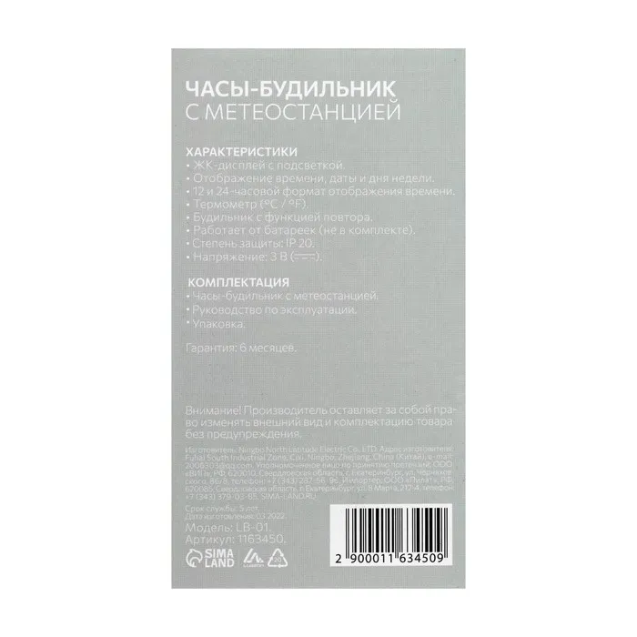 Метеостанция Luazon LB-01, с часами, термометром, дисплеем, подсветкой, серая — Характеристики