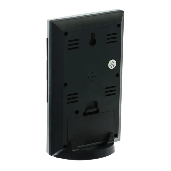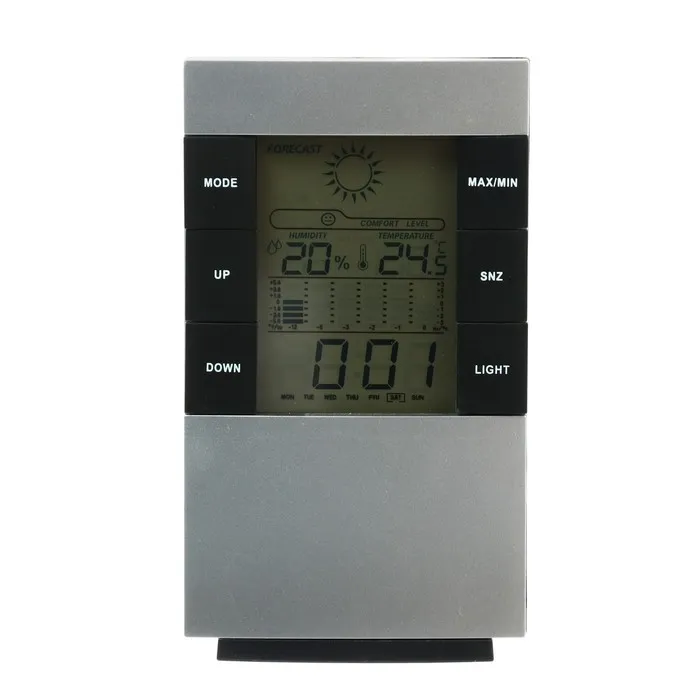 Электронные часы «Прогноз погоды» удобны в использовании и многофункциональны. Лёгкая настройка обеспечивается кнопками, расположенными на лицевой стороне устройства. На дисплее отображается дата, время, температура воздуха в помещении и влажность. С обратной стороны часов есть петля для того, чтобы прибор можно было повесить на стену.