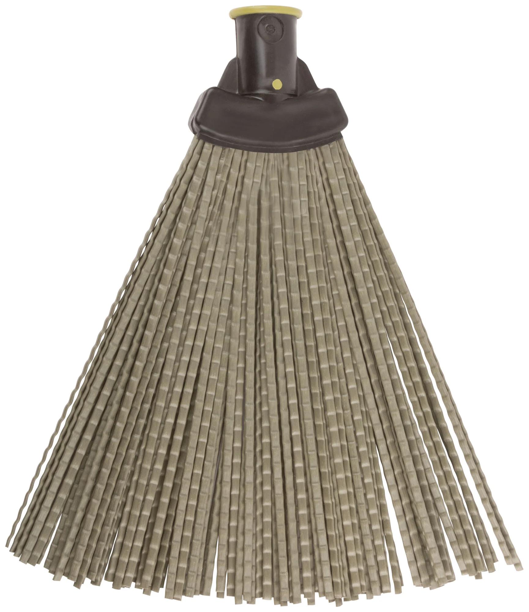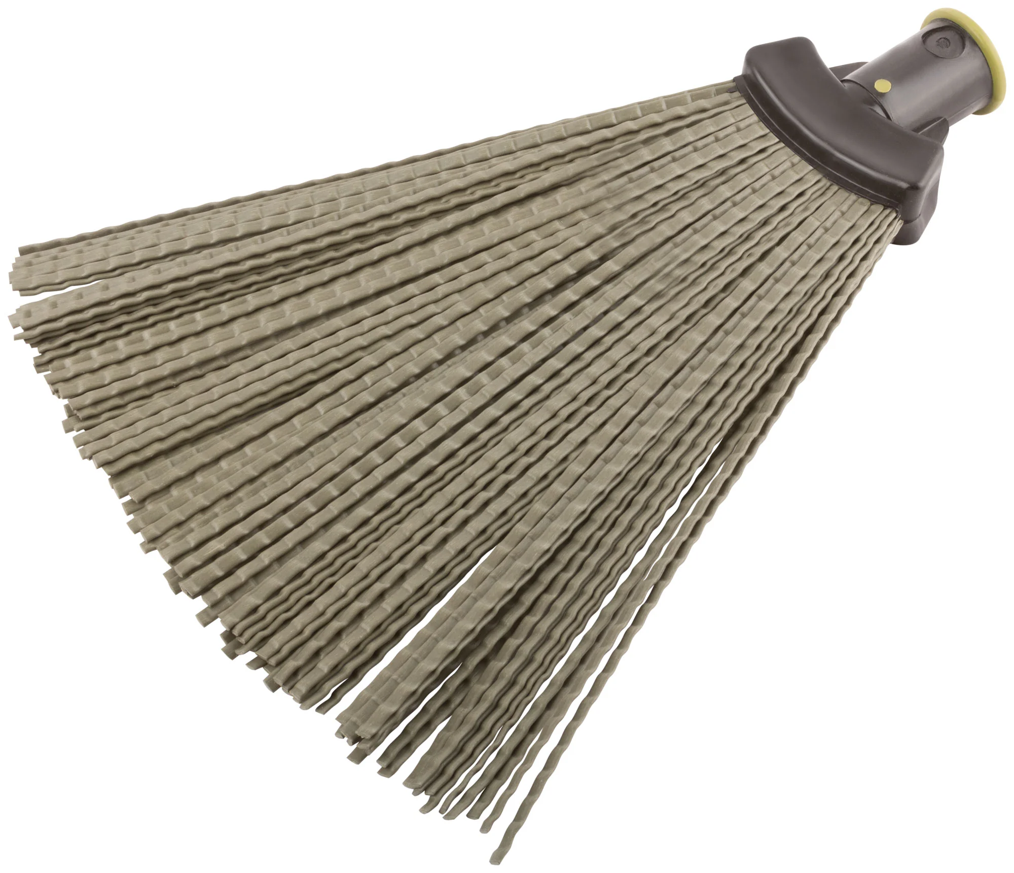 Метла имеет посадочный диаметр 25 мм и может использоваться как с обычным деревянным черенком, так и с черенками с резьбовым наконечником, что делает её универсальной в использовании. Пластиковая щетина длиной 250 мм обеспечивает эффективный сбор мусора.