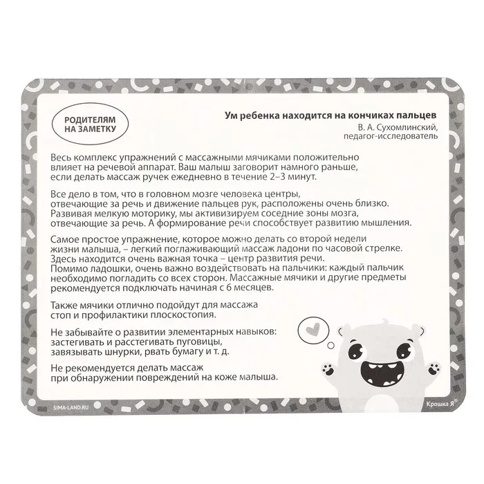 Мячик облдает рельефной поверхностью, способствующей развитию мелкой моторики и тактильных ощущений. Фактурная поверхность стимулирует и благотворно воздействует на нервные окончания, ответственные за большинство процессов в организме! Игрушкой можно не только играть в комнате, можно купаться, заниматься и делать массаж крохе. Яркие цвета мячиков помогают развить зрение.