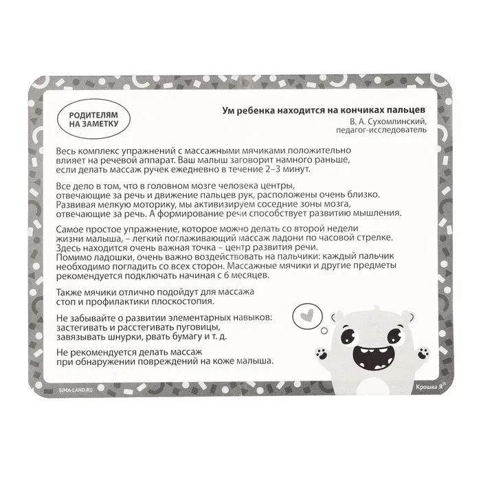Мячики торговой марки Крошка Я обладают рельефной поверхностью, способствующей развитию мелкой моторики и тактильных ощущений. Фактурная поверхность стимулирует и благотворно воздействует на нервные окончания, ответственные за большинство процессов в организме! Игрушкой можно не только играть в комнате, можно купаться, заниматься и делать массаж крохе. Яркие цвета мячиков помогают развить зрение.