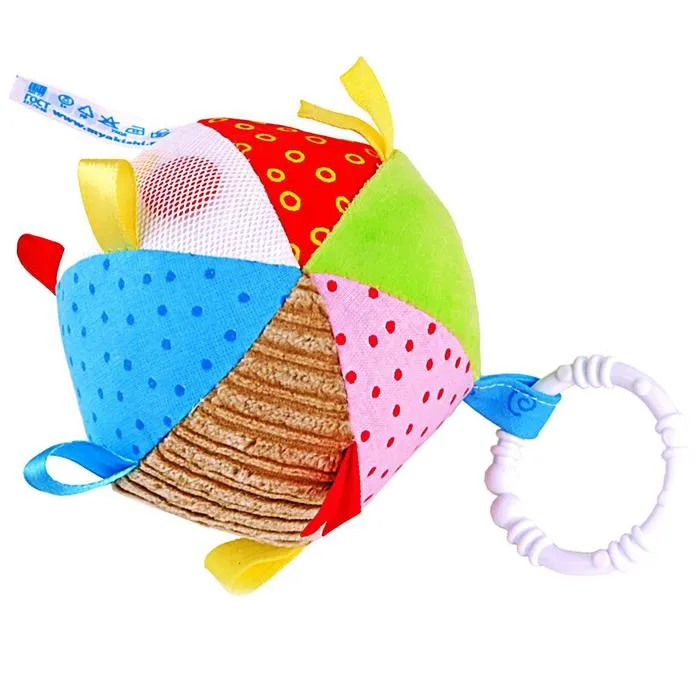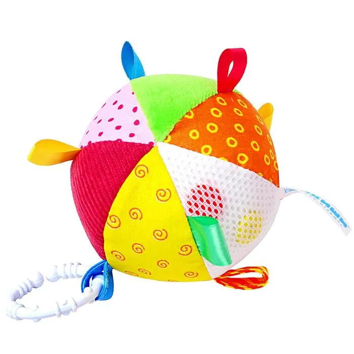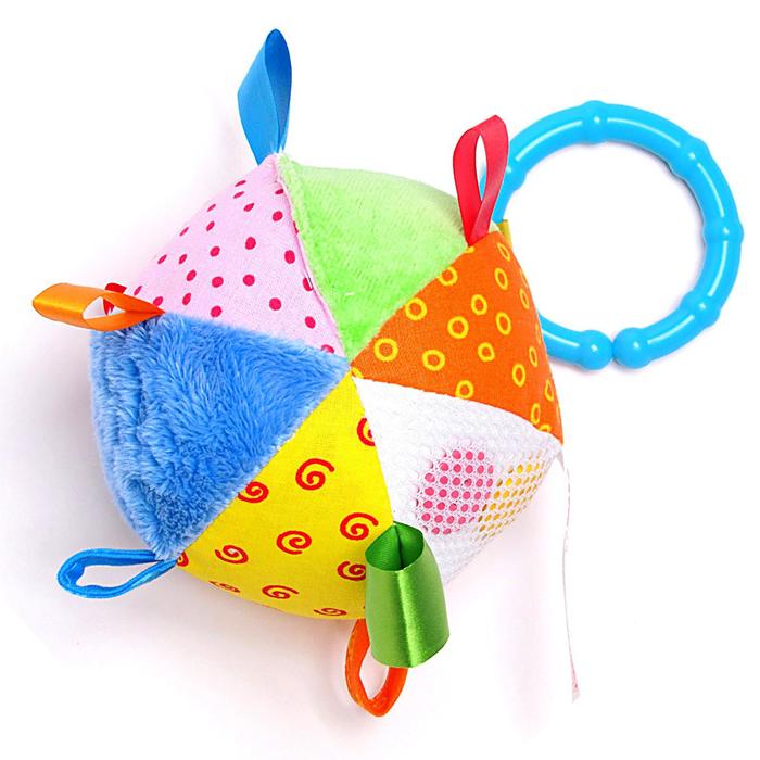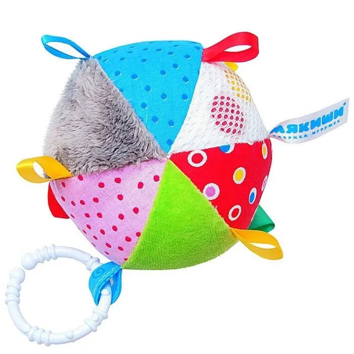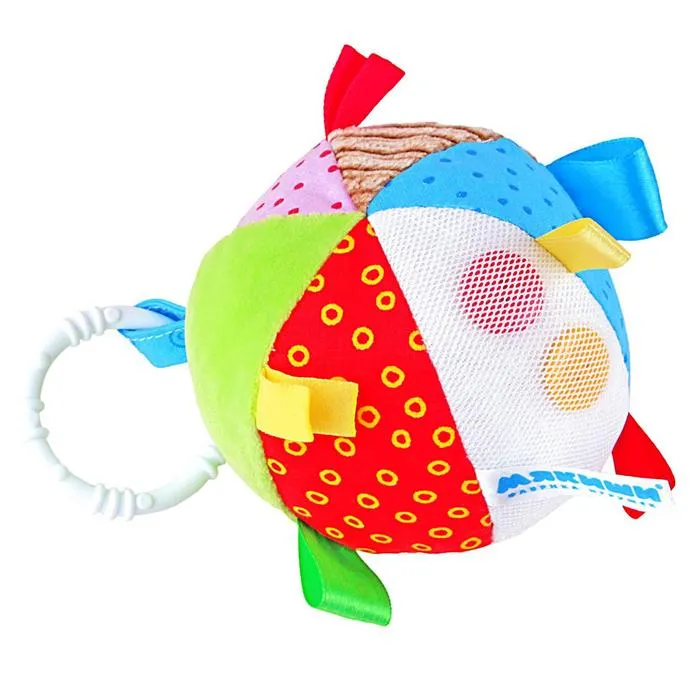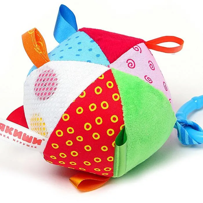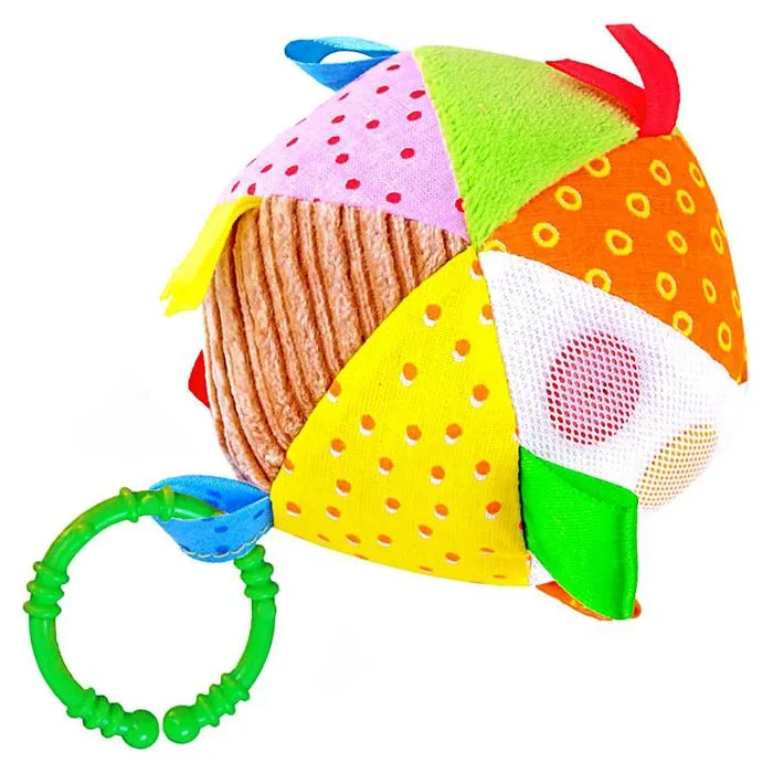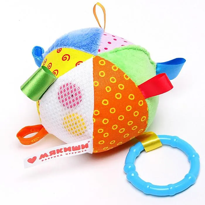 Занимательный мячик из разнофактурных лоскутков с шелестящим наполнителем станет любимой игрушкой любознательного малыша. Перебирая петельки с пуговками и тряся погремушкой, кроха тренирует моторику, развивает тактильное и звуковое восприятие.
