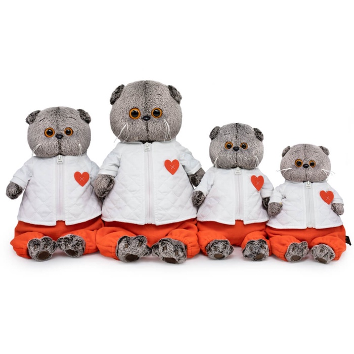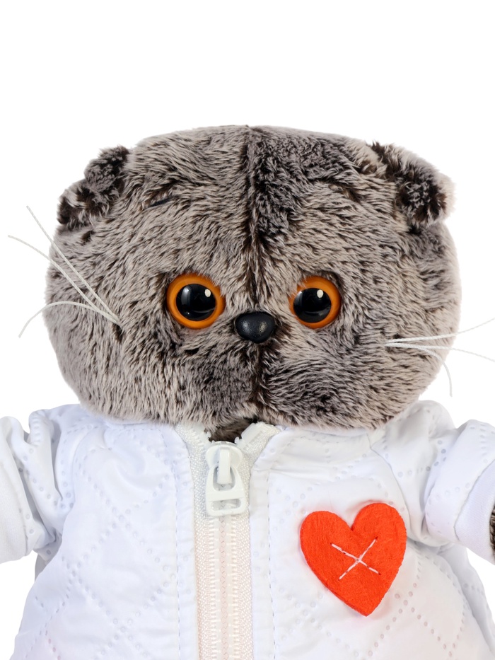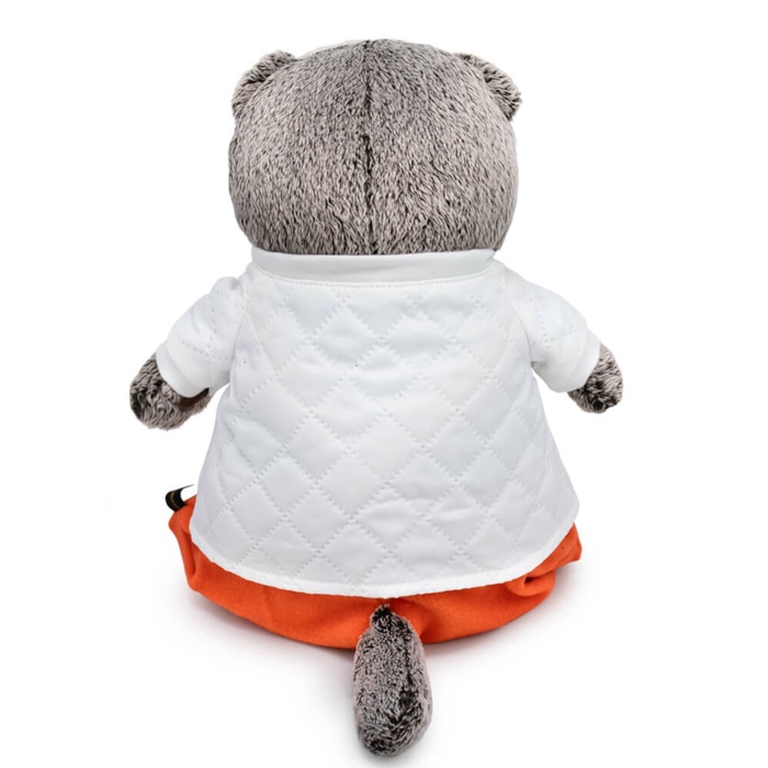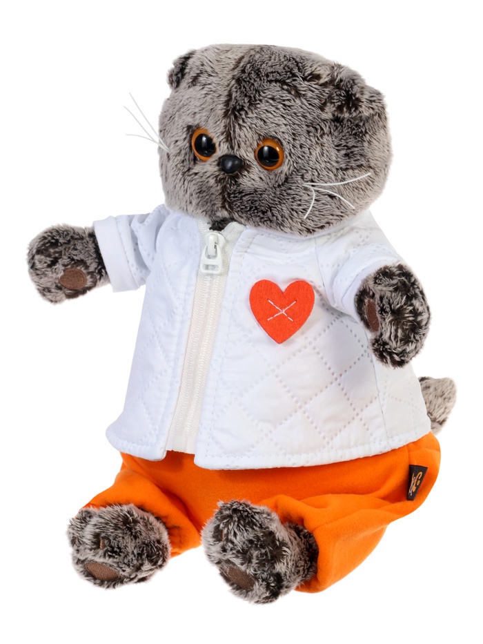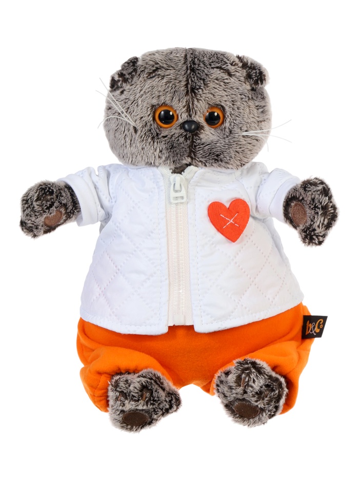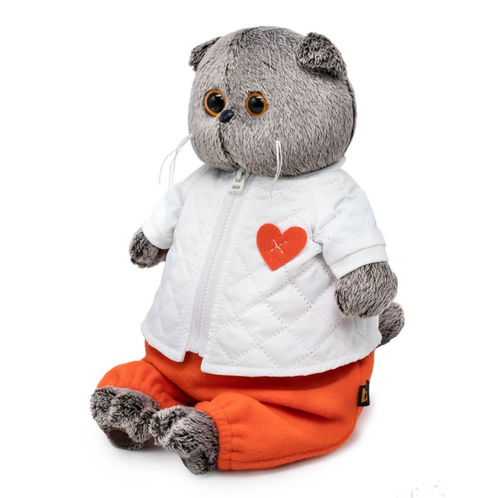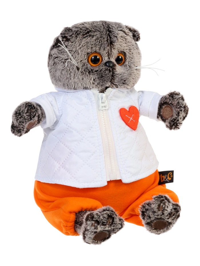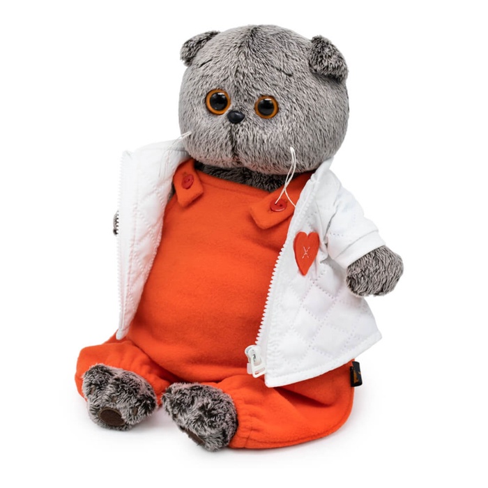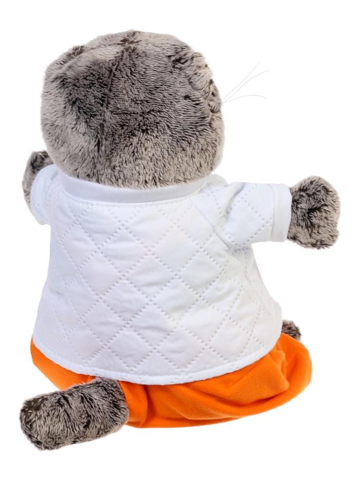 - Котик одет в белоснежную стёганую куртку на молнии и ярко-оранжевый комбинезон из мягкого флиса с лямками, пуговками и резиночками по низу штанин, подчёркивая его стильный и уютный образ.