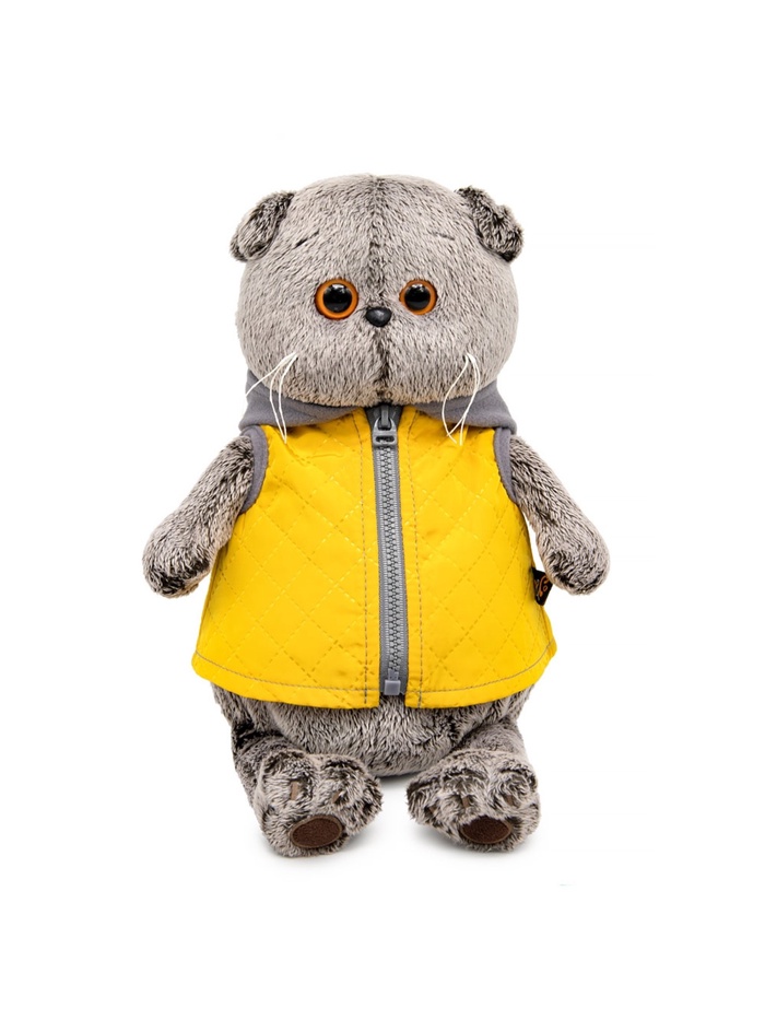 Мягкая игрушка «Басик в жёлтой жилетке с серым капюшоном» — уютный и стильный котик в современном повседневном образе. Яркая стеганая жилетка с молнией и мягкий капюшон придают игрушке характер и делают её особенно привлекательной. Басик остаётся таким же приятным на ощупь, как и классическая версия, но с модным акцентом, который понравится и детям, и взрослым коллекционерам.