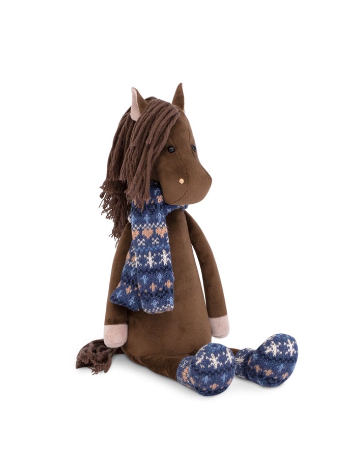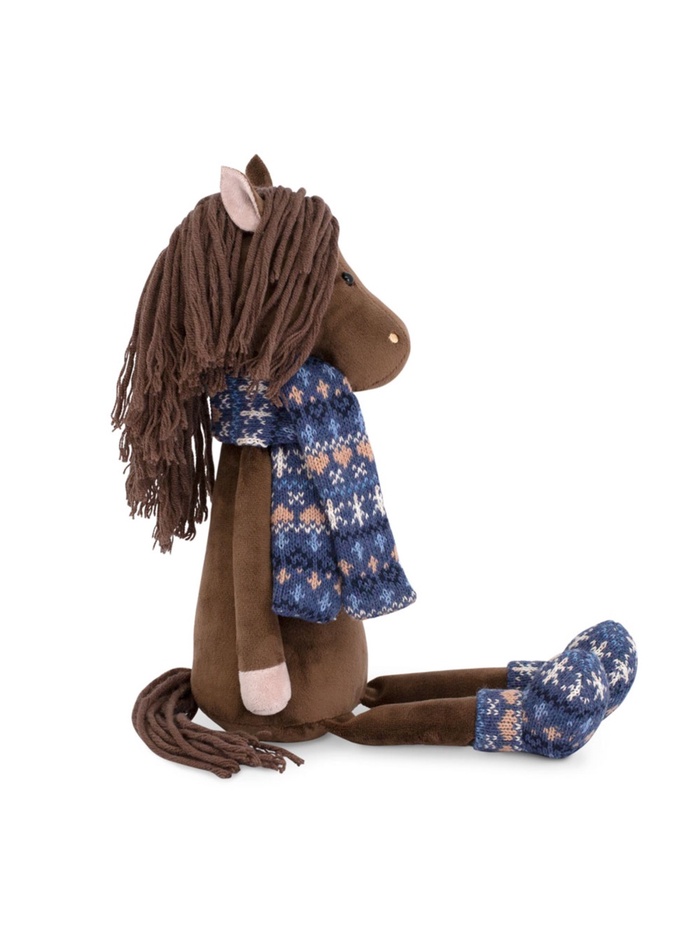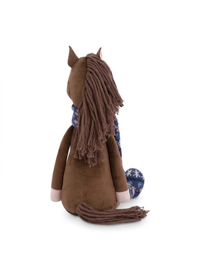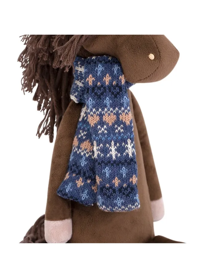 - Игрушка выполнена в виде милого коня с мягкой текстурой искусственного меха и стильной одеждой: шарфом и чунями.