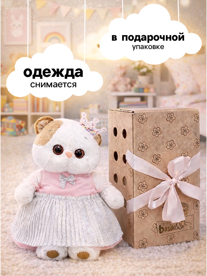 Мягкая игрушка «Кошечка Ли-Ли в платье и с короной» — это очаровательная героиня в праздничном образе. Её нежное платье с серебристой юбкой и розовым лифом, украшенным бантиком, создаёт атмосферу торжества, а корона с блестящими элементами завершает наряд. Мягкий мех делает игрушку особенно приятной на ощупь, а добрый взгляд, любимицей детей и коллекционеров.