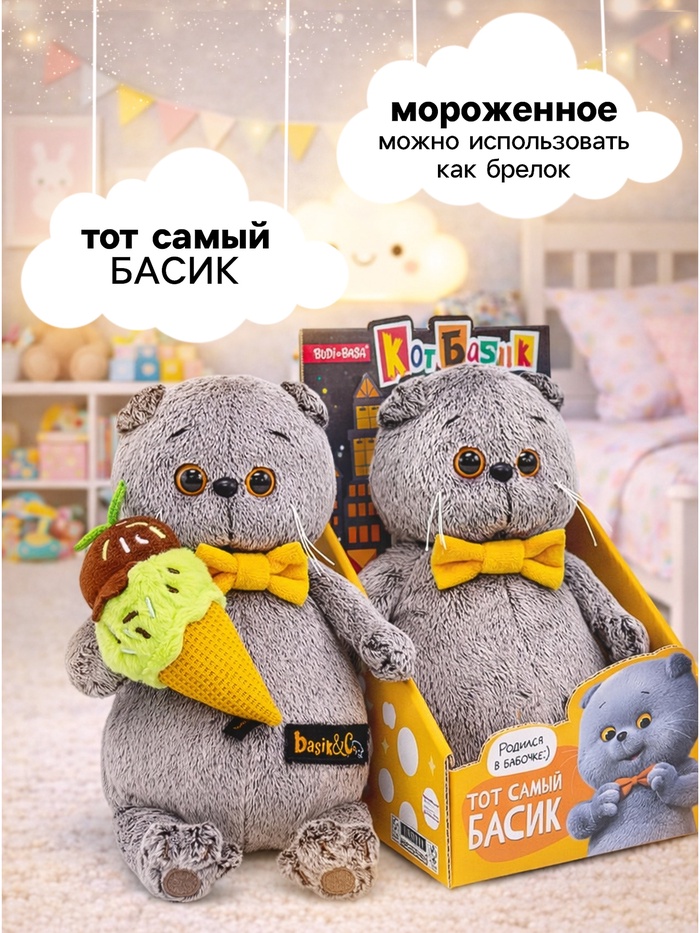Мягкая игрушка «Кот Басик с мороженым» — обаятельный котик, который словно сошёл с летней открытки. Он держит в лапке мягкое мороженое, а яркий жёлтый бантик добавляет образу солнечного настроения. Басик подарит тепло, уют и станет любимым другом ребёнка или стильным украшением комнаты.
