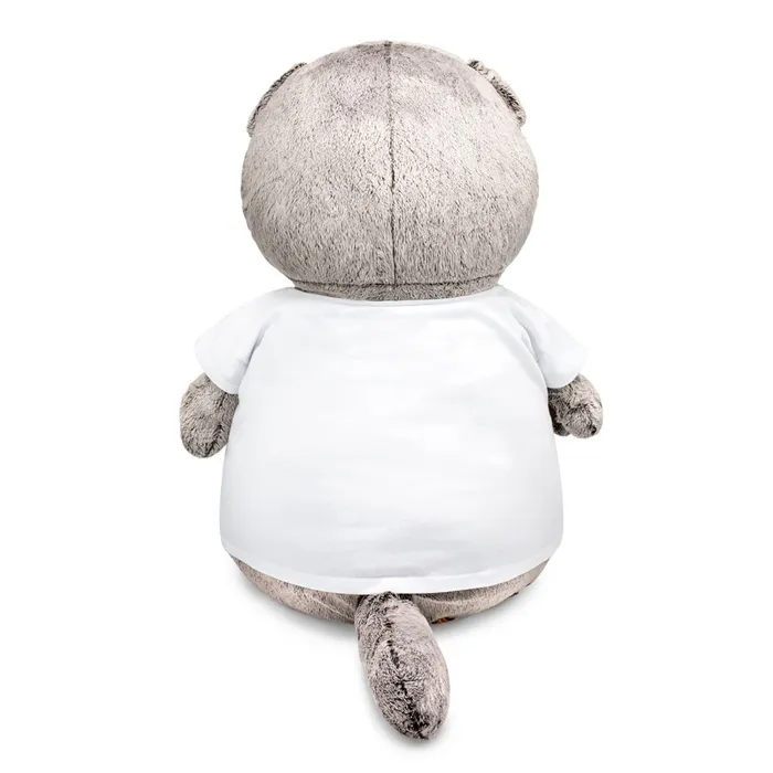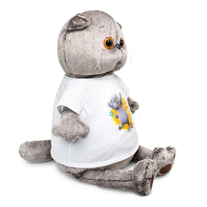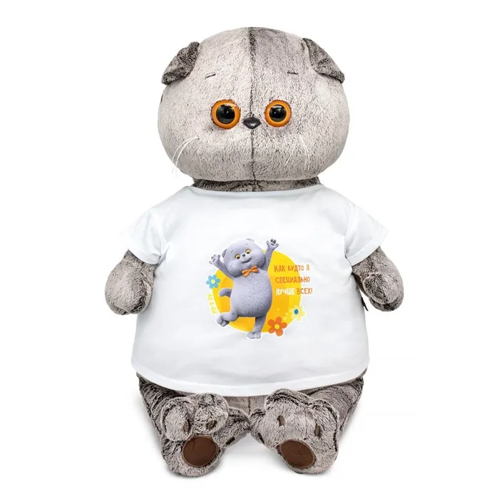 Маленький «Кот Басик» в футболке с принтом — это очаровательная мягкая игрушка, которая станет идеальным подарком для близкого человека или стильным аксессуаром для дома. Его размер и дизайн делают его заметным элементом интерьера или удобным компаньоном для игр.