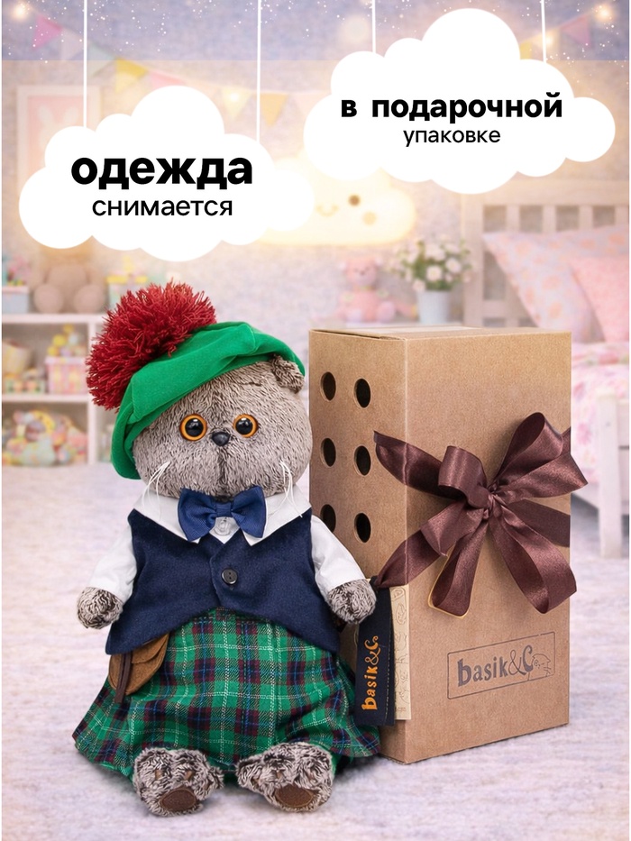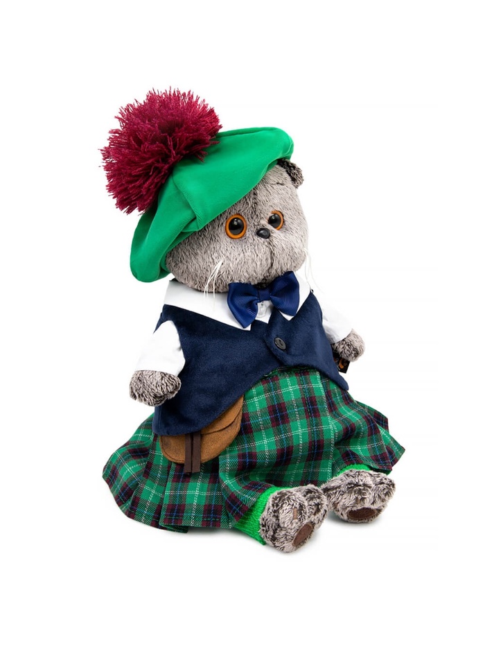 Мягкая игрушка «Басик в шотландском костюме» — уютный коллекционный кот, одетый в традиционный шотландский образ. Килт в клетку, жилет, рубашка, берет с помпоном и аккуратная бабочка создают яркий и запоминающийся стиль, который делает игрушку отличным подарком и украшением интерьера.