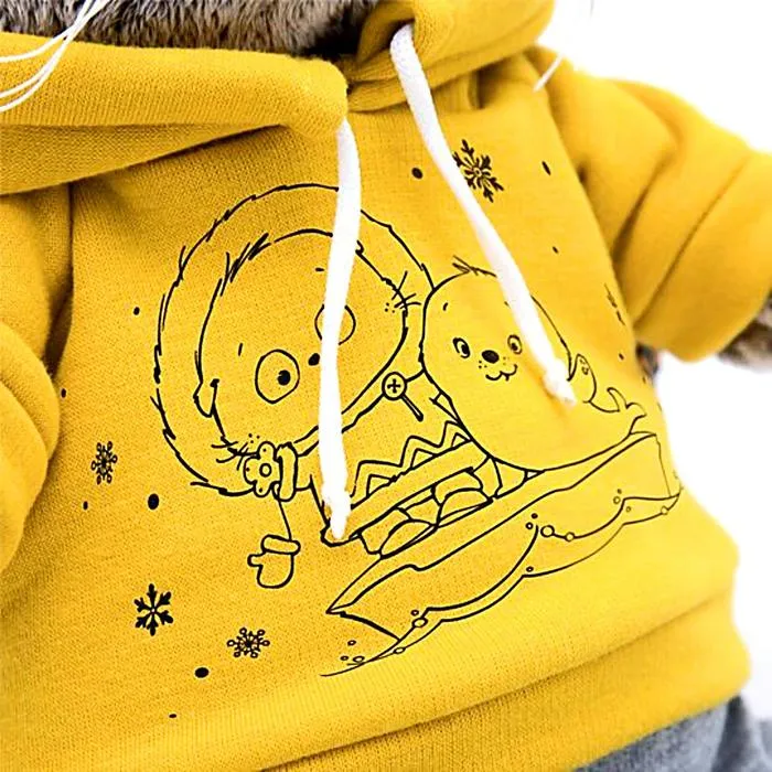 - Уютный образ Басика состоит из свитшота с капюшоном цвета одуванчика из х/б футера с оригинальным принтом «Басик на севере» и штанишек из дымчатого футера с белыми лампасами.