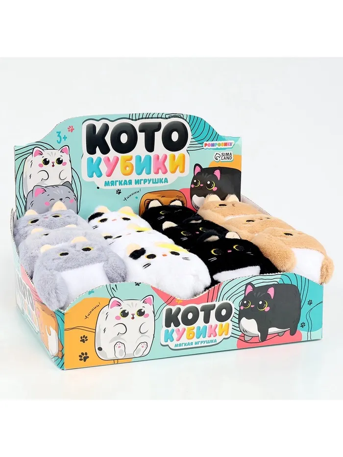 - Набор включает 12 мягких игрушек в виде котов, выполненных в форме кубиков.