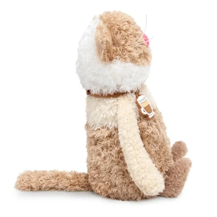 - Игрушка изготовлена из эко меха в трёх оттенках: молочного какао, топлёного молока и белоснежного цвета. Усики из шелковистого крученого шнура. Объёмный носик обтянут розовым софтом. На шейке у котика силиконовый чокер с небольшим подвесом в виде чашечки с кофе американо, который легко снимается. На пяточках и внутри ушек вшит сливочный софт.