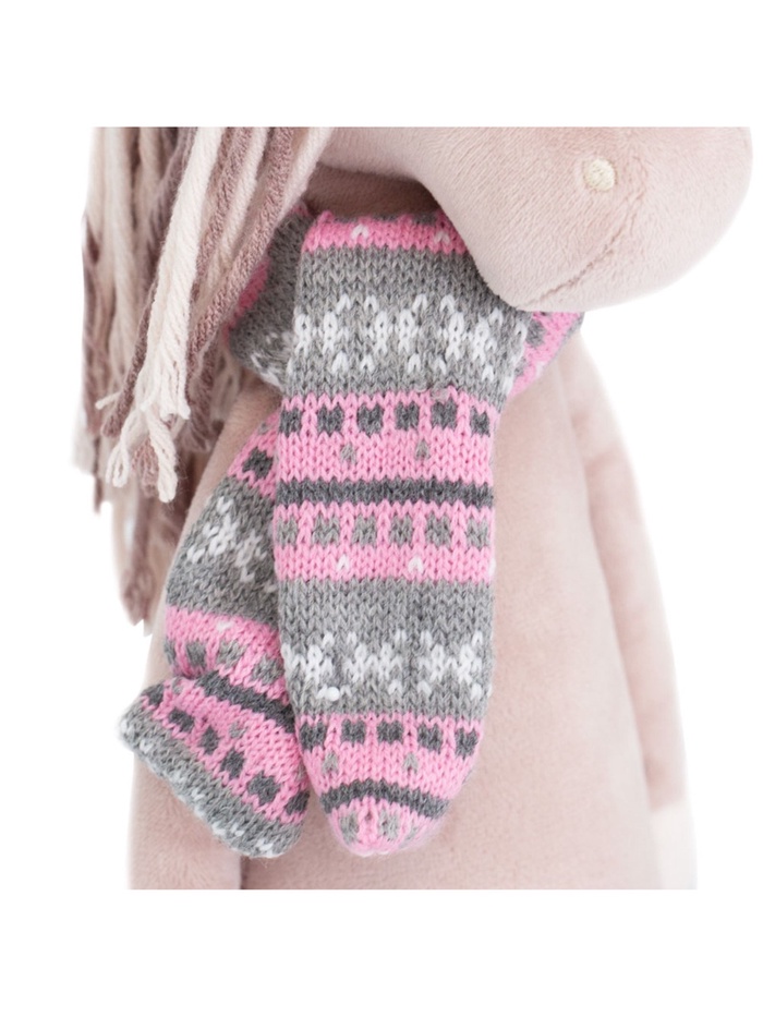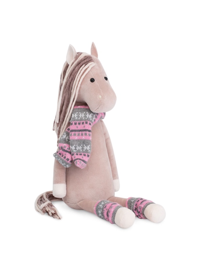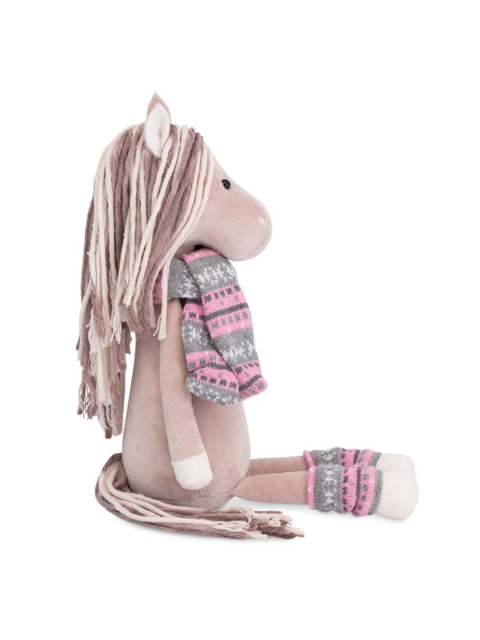 - Игрушка выполнена в виде милой лошадки с мягкой текстурой искусственного меха и стильной одеждой: шарфиком и гетрами.