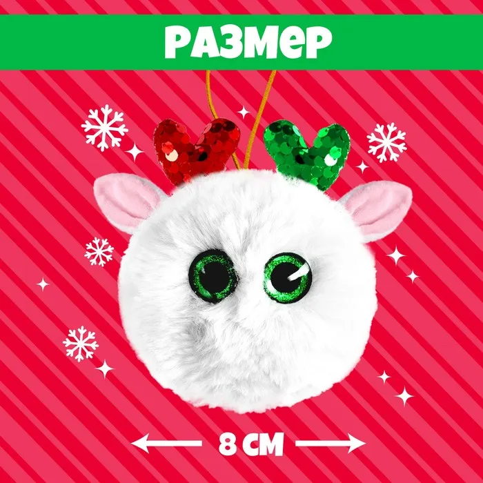 - Диаметр игрушки — 8 см (без учёта длины ушек и рожек).