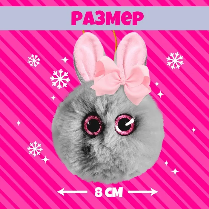 - Диаметр игрушки — 8 см (без учёта длины ушек и хвостика).