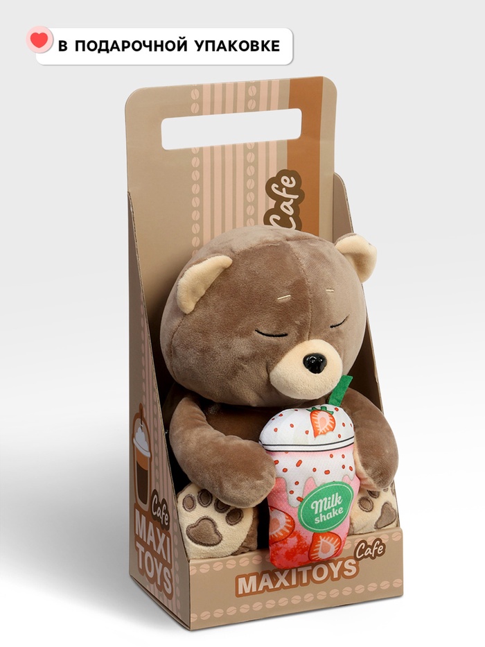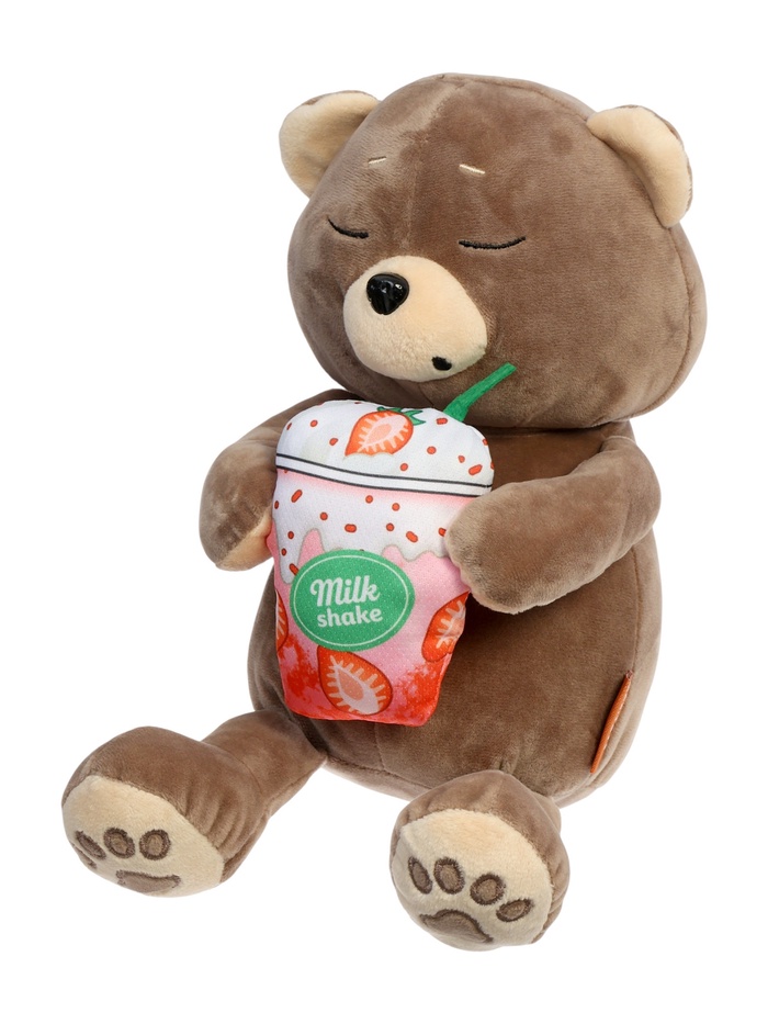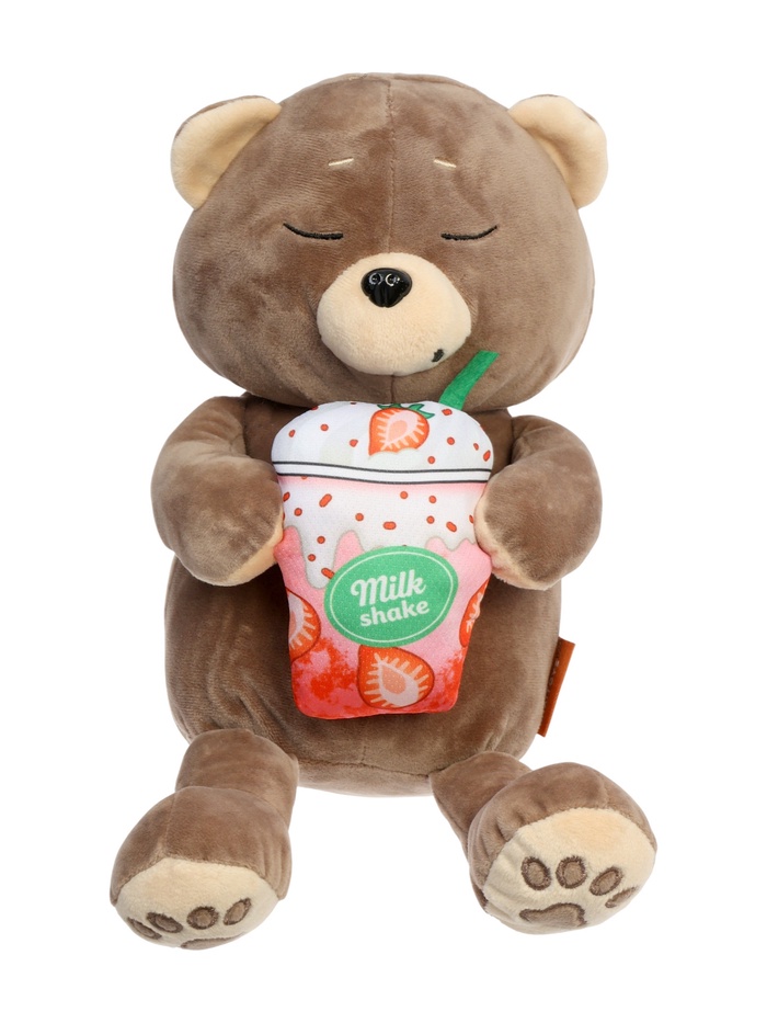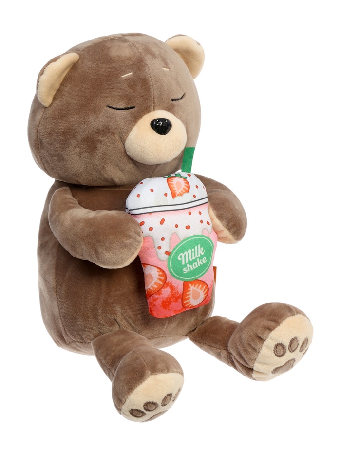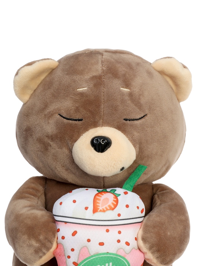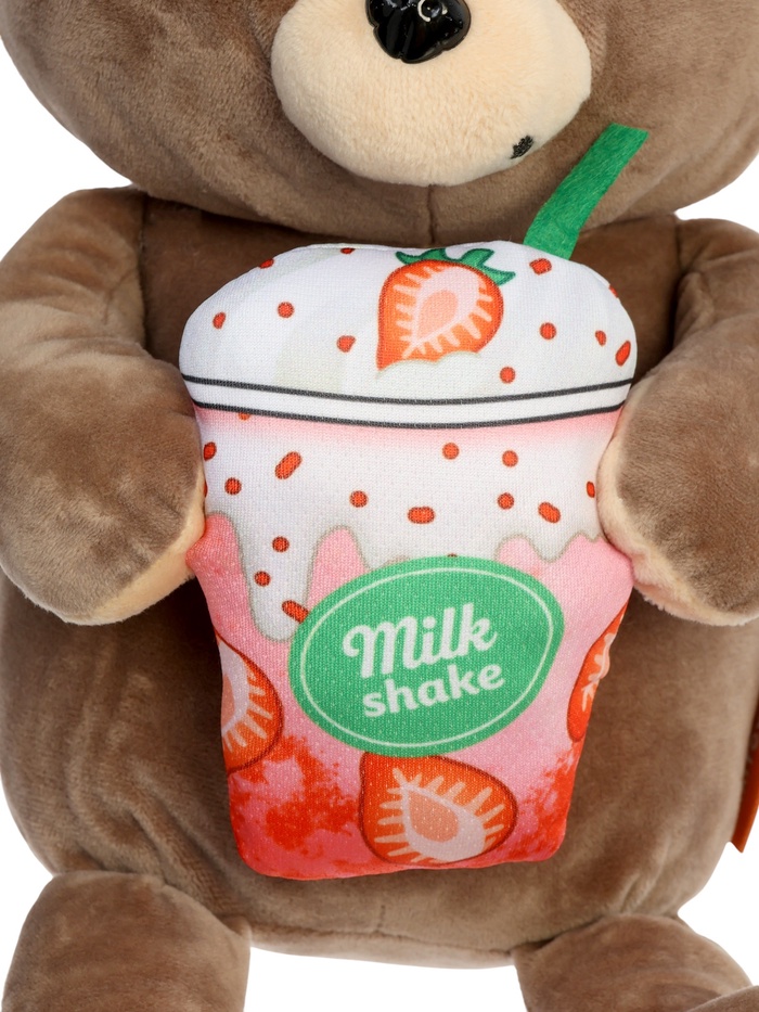 - В лапках мишки — милый аксессуар в виде стакана с клубничным милкшейком, что подчёркивает его игривый характер и уникальность.