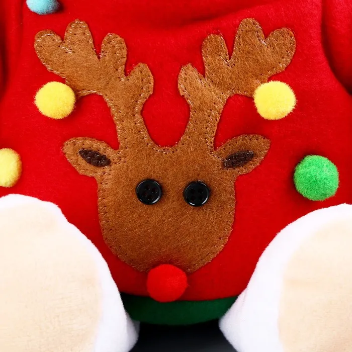 - Декоративная деталь, в виде новогоднего колпака и теплого красного свитера, придаёт игрушке особый шарм и делает её уникальным новогодним подарком.
