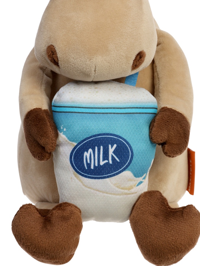 - Рудольф держит в руках стаканчик с молоком, что подчёркивает его любовь к уютным моментам и спокойным занятиям.