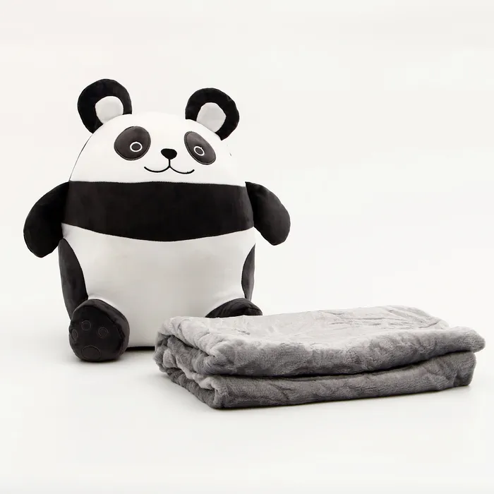 • Игрушка выполнена в виде очаровательной панды, которую можно использовать как подушку, а пледом укрыться, добавляя функциональности и практичности.