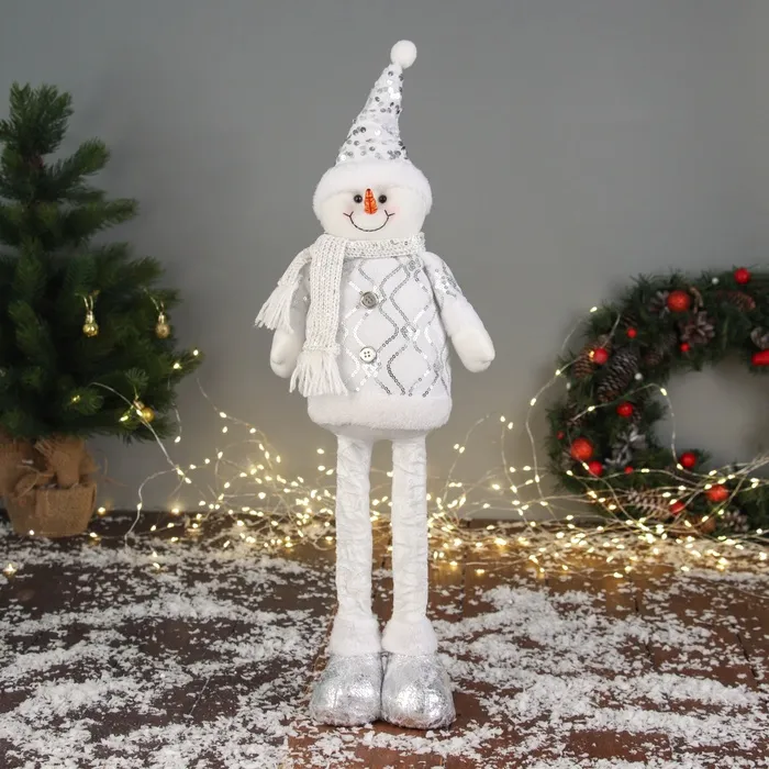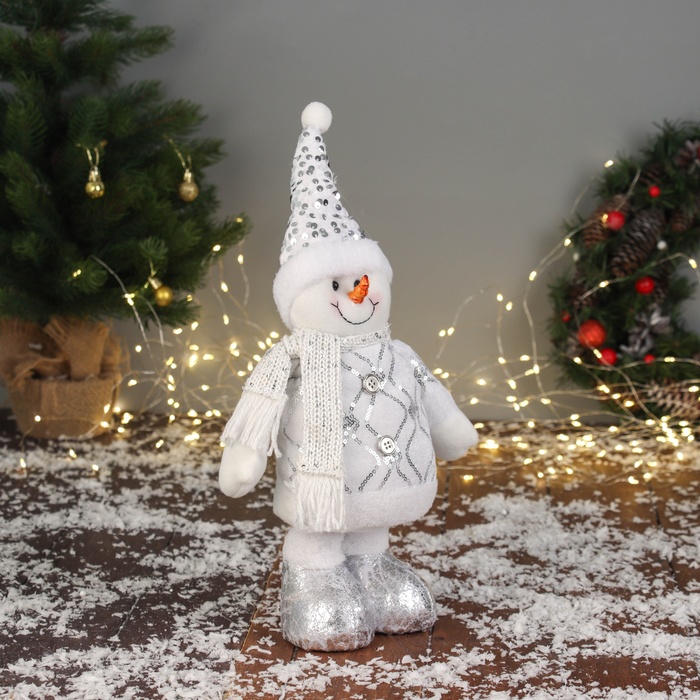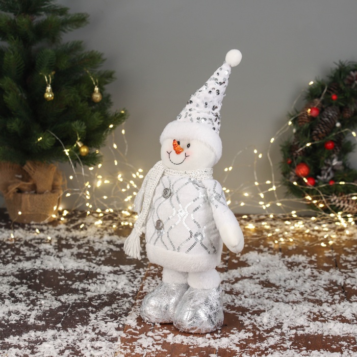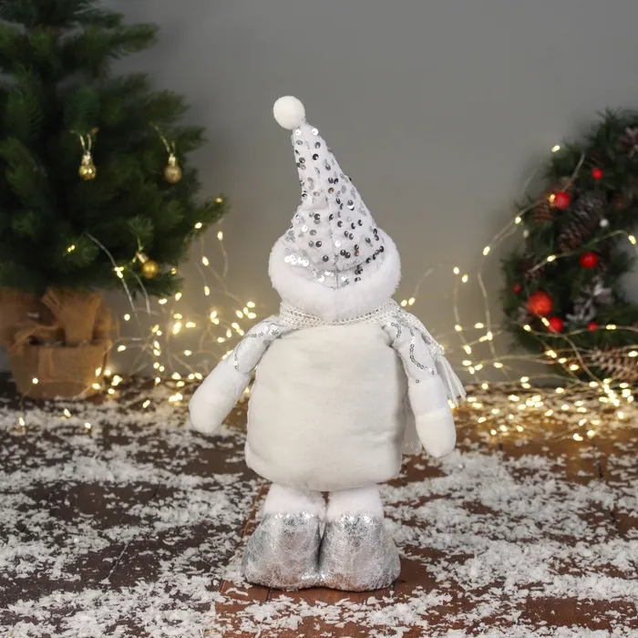 Мягкая игрушка "Снеговик блеск" (59х21 см выдвинутые ножки) 40х21 см, серебристо-белый — Характеристики