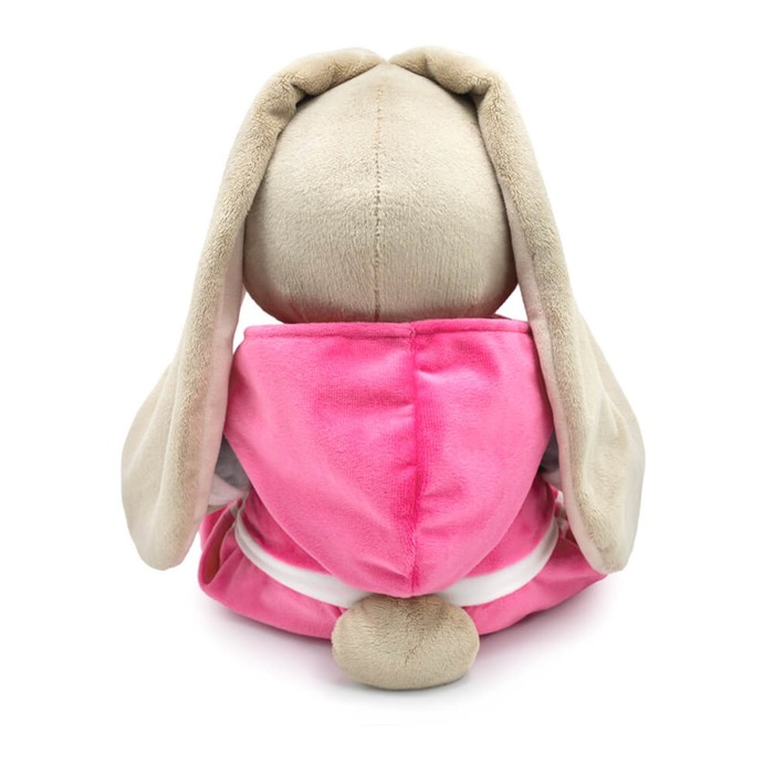 - На зайке курточка с капюшоном, выполненная из розового, серого и белого софта. Спереди курточка застёгивается на белую молнию и украшена белым сердечком из эко‑кожи. Штанишки в комплекте сшиты из розового софта.