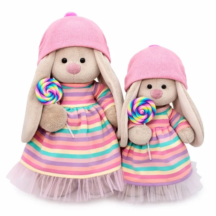 Милая мягкая игрушка «Зайка Ми» — это хороший подарок для ребёнка или кукольного коллекционера. На зайке трикотажное платье в полоску, которое сочетается с разноцветным леденцом, на голове розовая шапочка. Все элементы одежды снимаются.