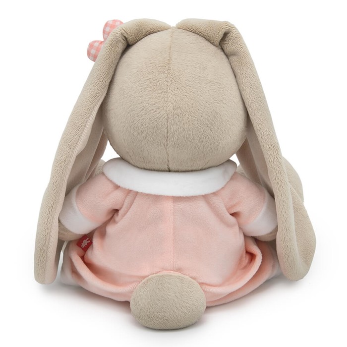 - На зайке невероятно мягкий комбинезон из софта пудрового цвета с белым воротничком и белыми отворотами. На ушке объёмный цветочек из клетчатой ткани в тон комбинезона.